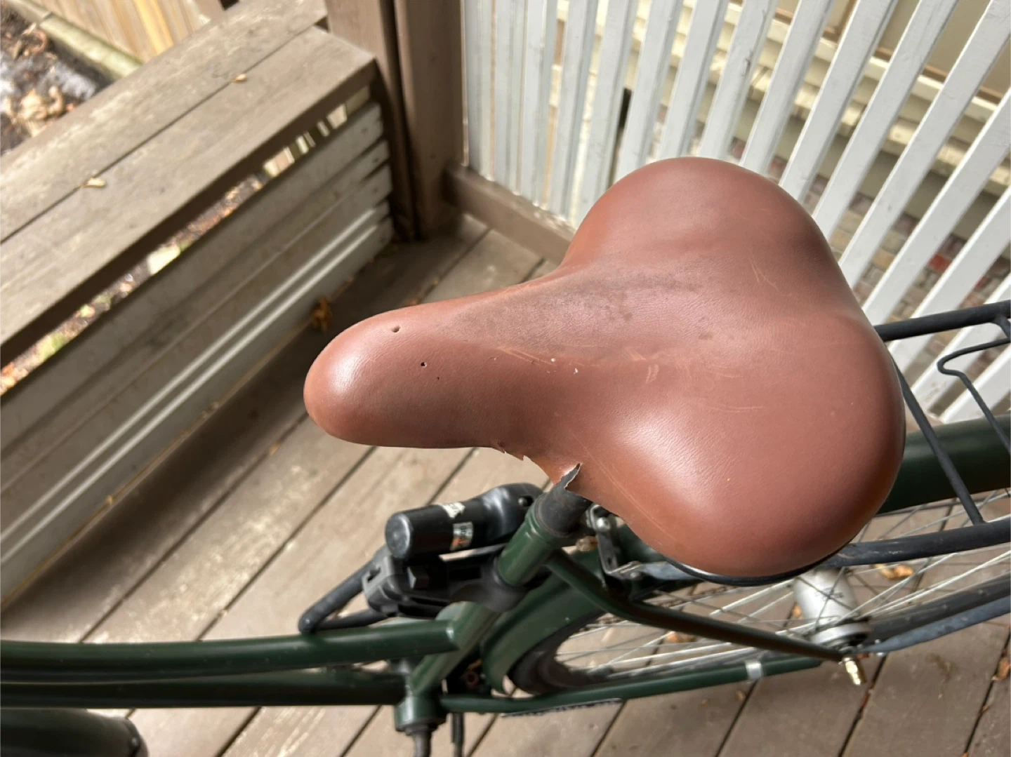 Bike was professionally tuned up last spring. New leather handle grips added in 2024. Seat has a few small tears. Front and back light details do not function. Chain has a bit of rust, but generally functions fine.