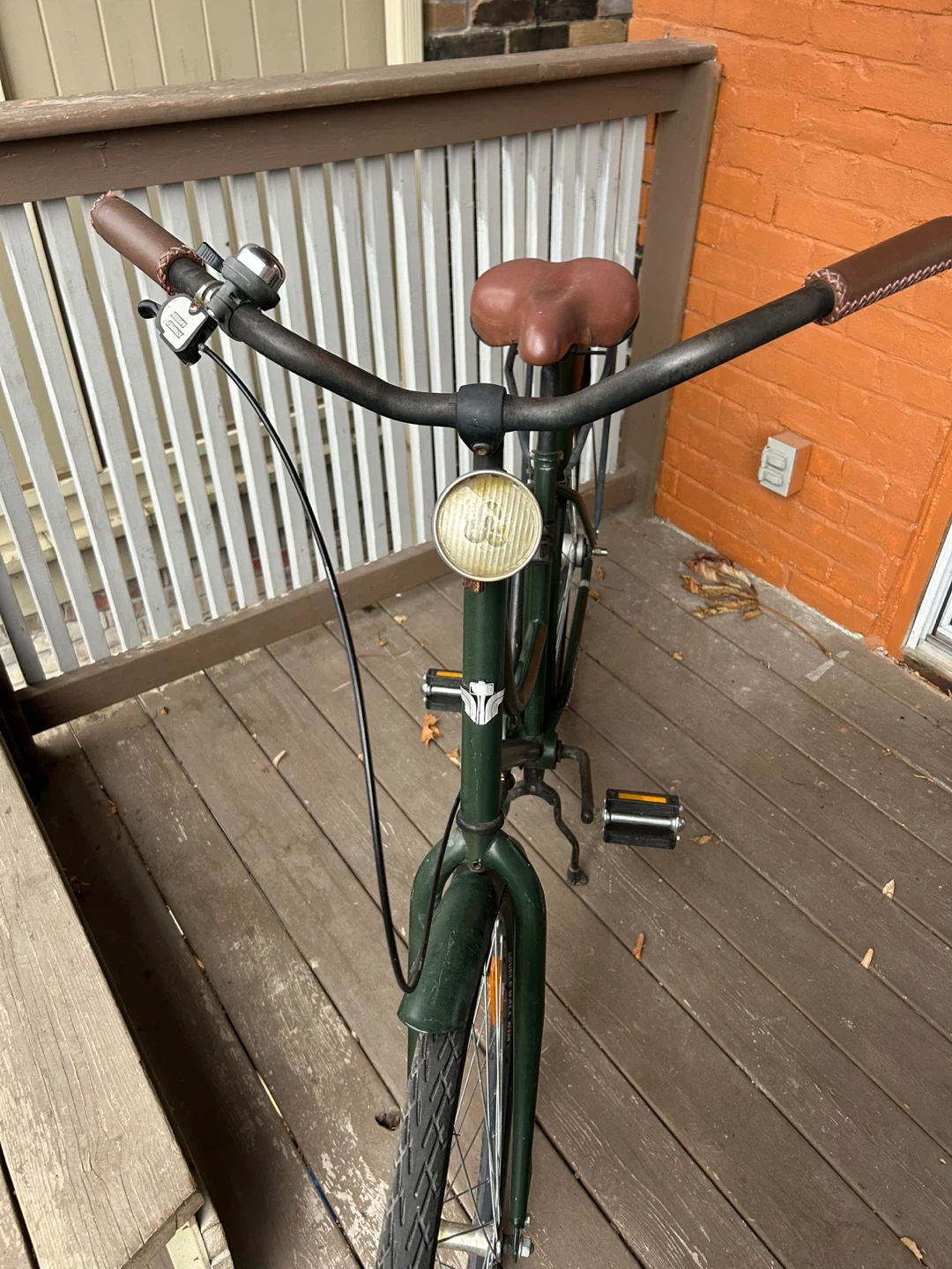 Bike was professionally tuned up last spring. New leather handle grips added in 2024. Seat has a few small tears. Front and back light details do not function. Chain has a bit of rust, but generally functions fine.