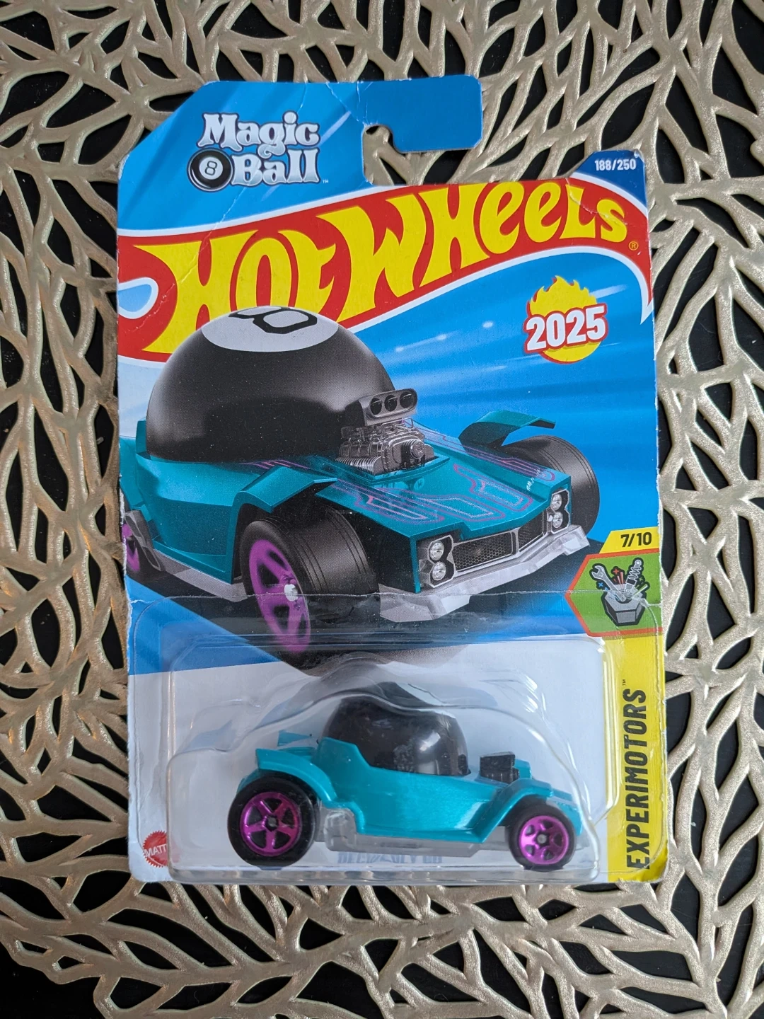 Selling a new in-package Hot Wheels car! It's the Magic 8 Ball 'Decidedly Go' model from the Experimotors series. The packaging indicates a manufacturing date of 2025. A fun addition to any collection! Minor wear on the box.