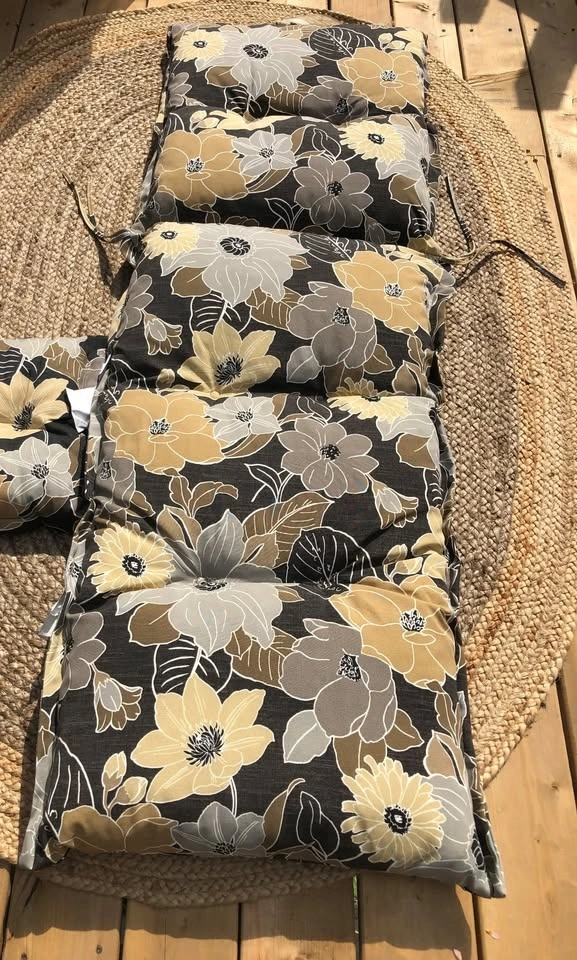 2 x Floral LOUNGER PATIO CUSHIONS. Measurements: 65x23in. Price is $180 for the set of 2. Small beige throw cushions are $10 each.