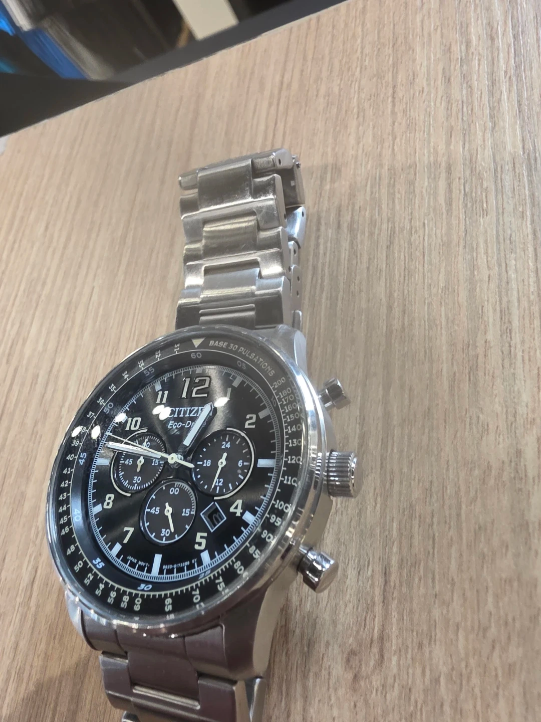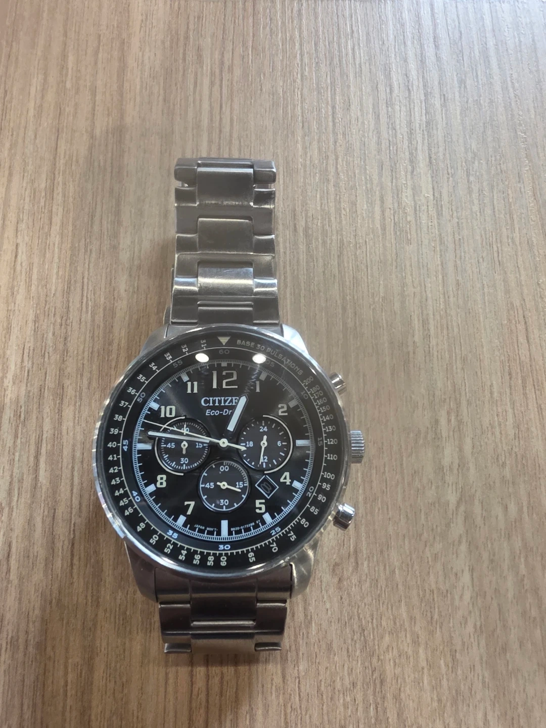 Selling a Citizen Eco-Drive Chronograph watch. It features a stainless steel band and a sleek black dial. The watch is in great condition and ready for a new wrist!
