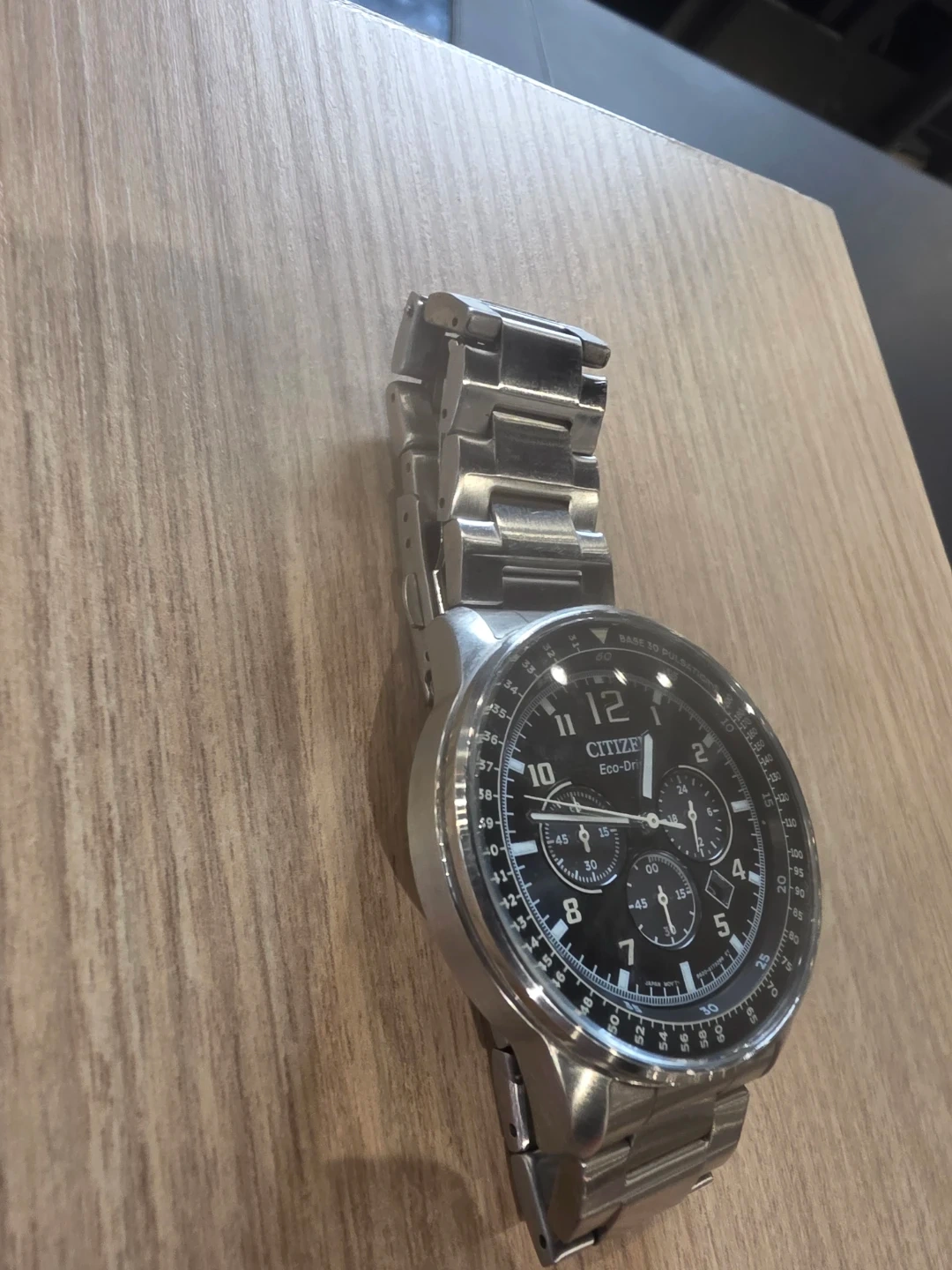 Selling a Citizen Eco-Drive Chronograph watch. It features a stainless steel band and a sleek black dial. The watch is in great condition and ready for a new wrist!
