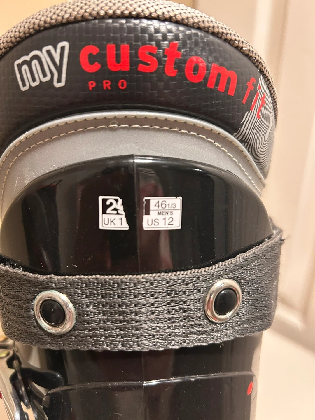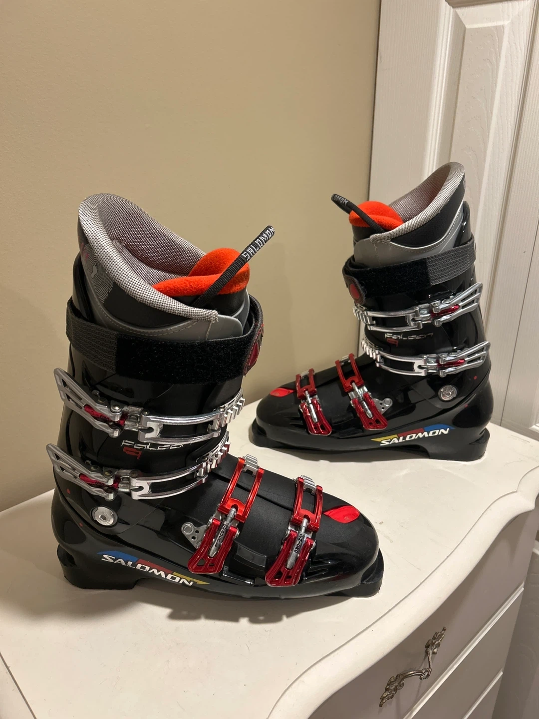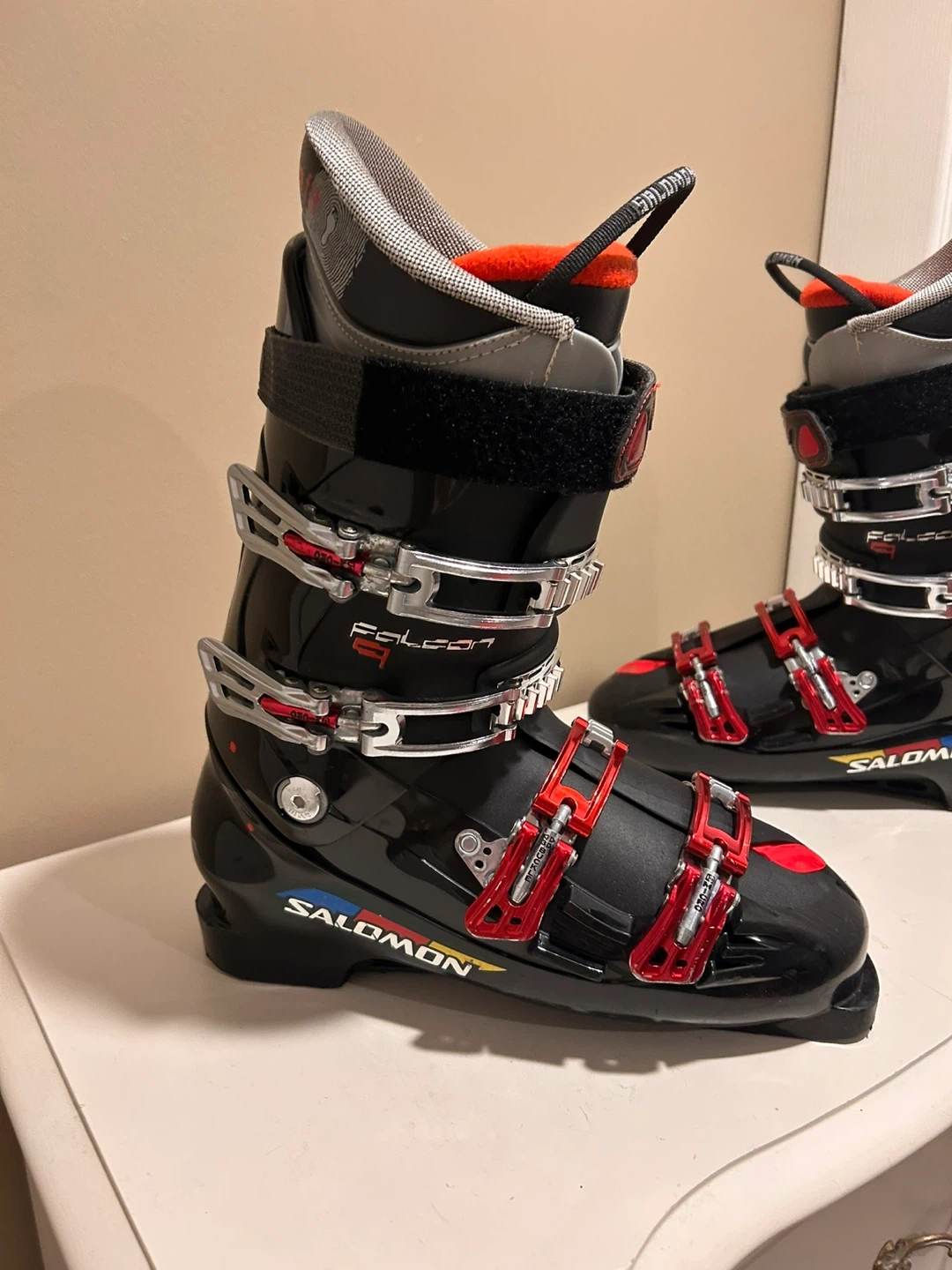Selling a pair of Salomon Falcon 9 ski boots in gently used but good condition. They feature a My Custom Fit Pro liner and a 3D buckle for maximum customization. The boots have a medium flex and are suitable for advanced to expert skiers. Size US 12. Shell size is 29/29.5