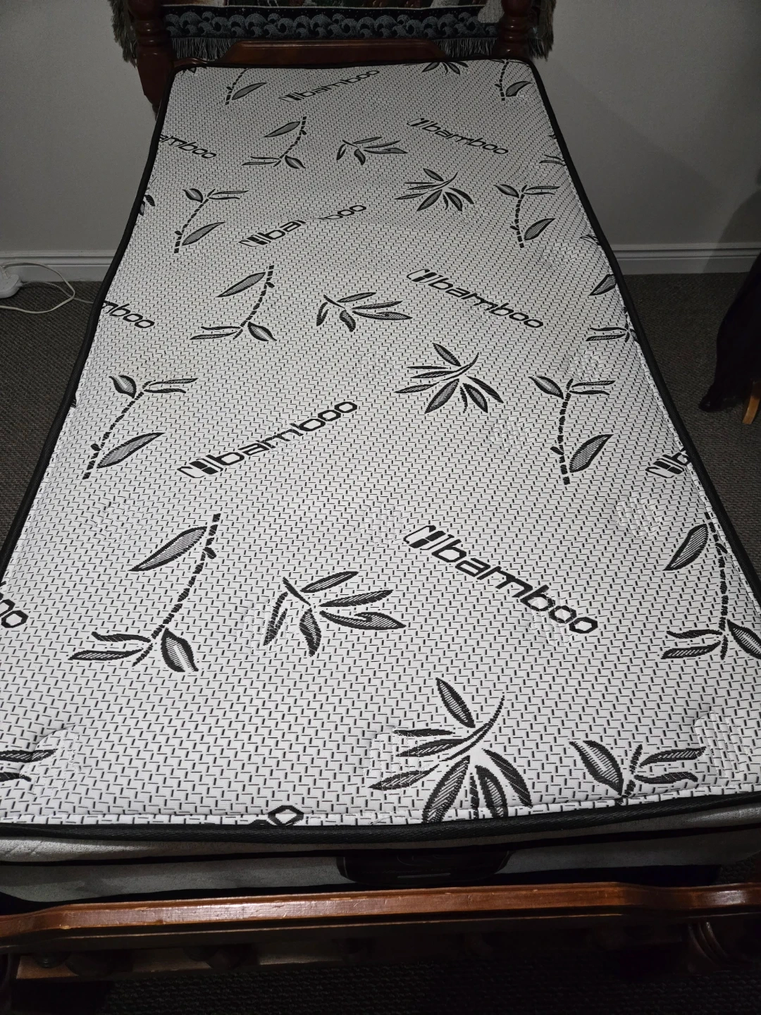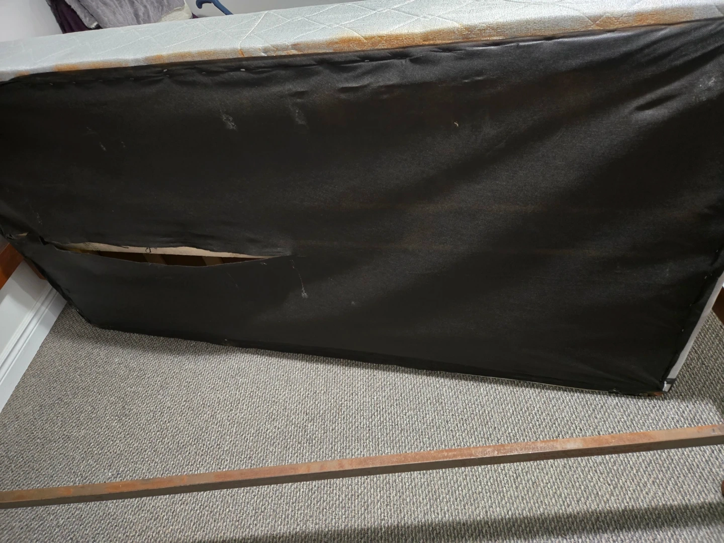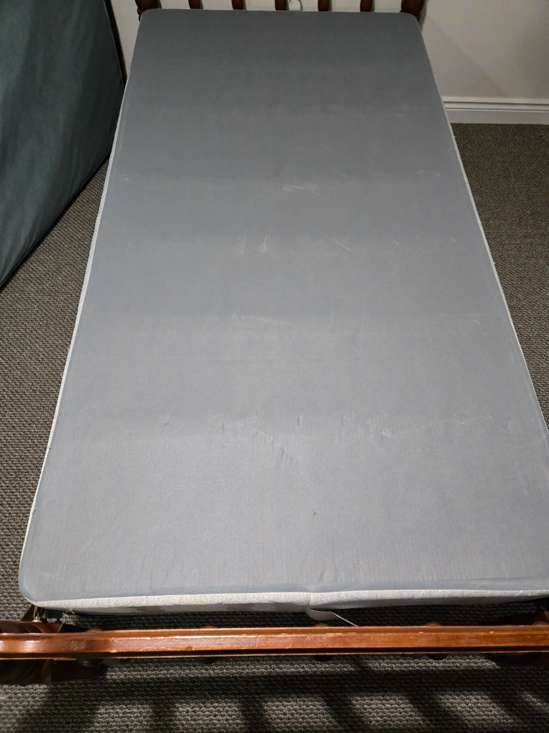 Selling a twin bed frame and mattress. The bed frame is made of wood and the mattress(bought 1 year ago) and box spring (2 years old) is included. There is some wear and tear on the box spring. Bed frame was purchased at the habitat for humanity restore. Comforter, 3 sheet sets and a bed skirt is included. Must be picked up...bed frame will be disassembled for moving.
