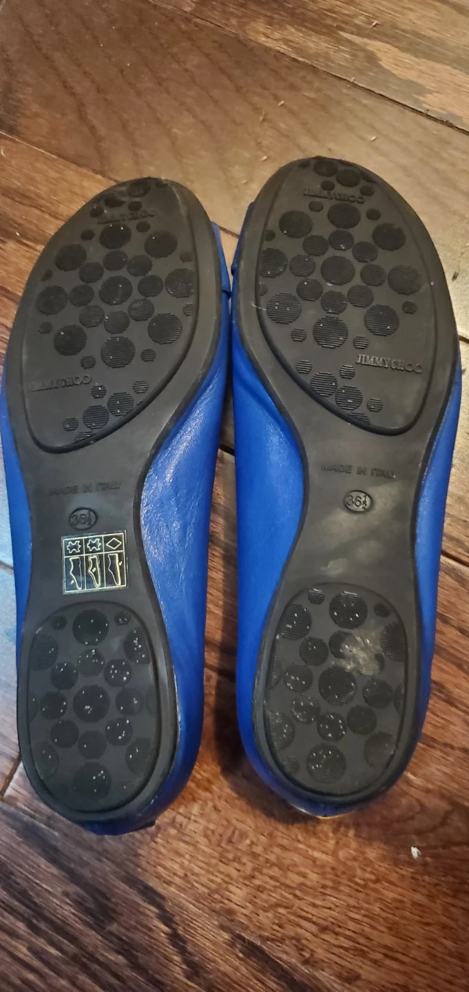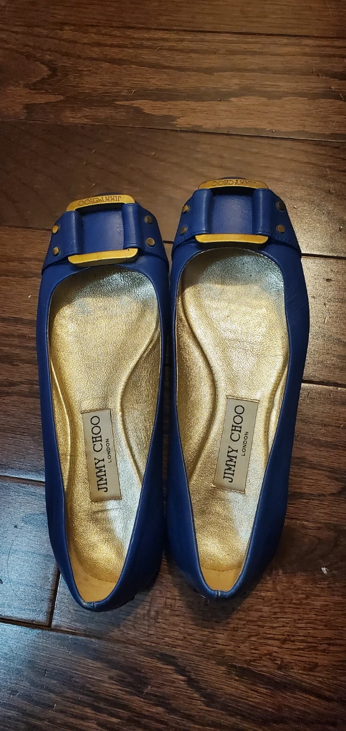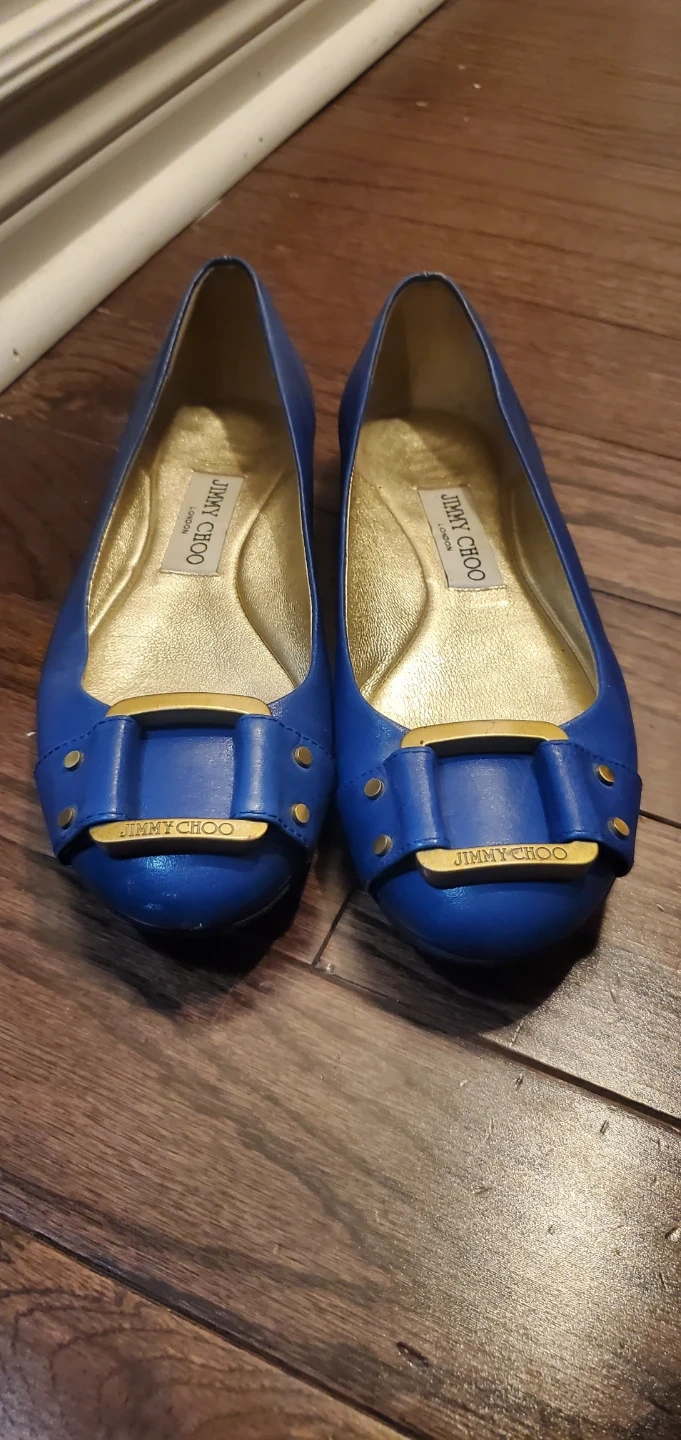 These are a pair of Jimmy Choo ballet flats in size 36.5. They're a beautiful blue colour and made of leather. Perfect for adding a touch of elegance to your everyday outfit!