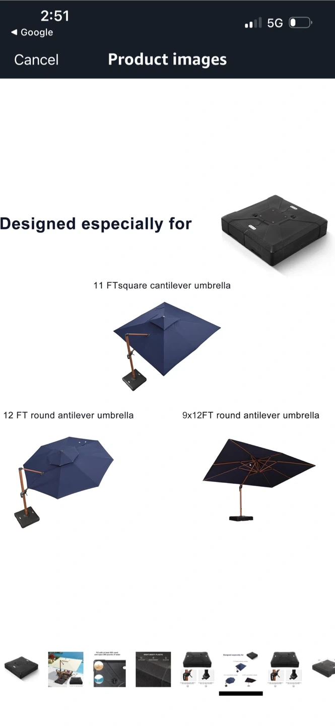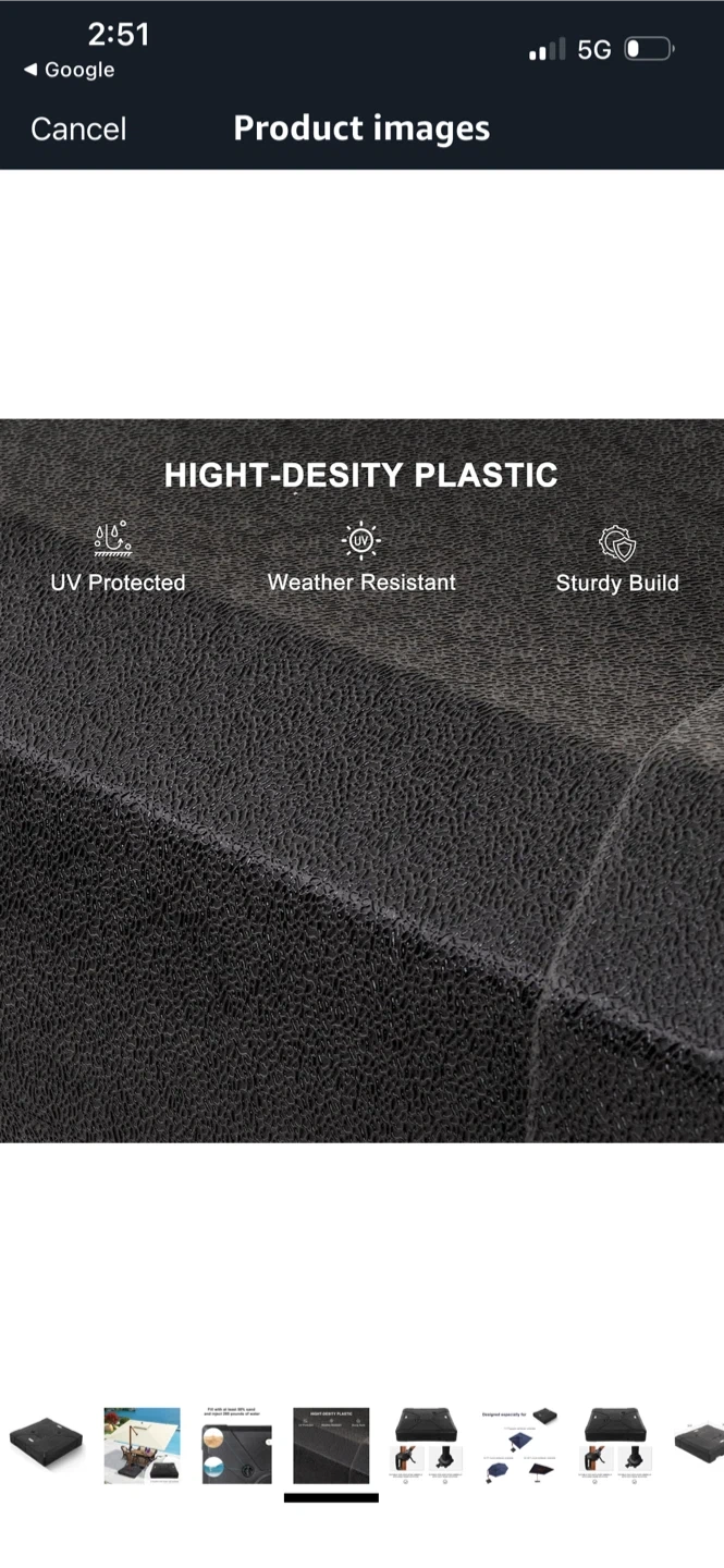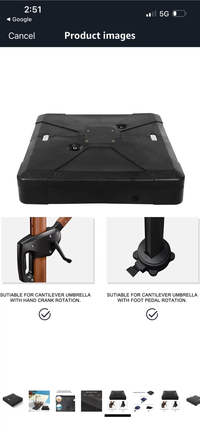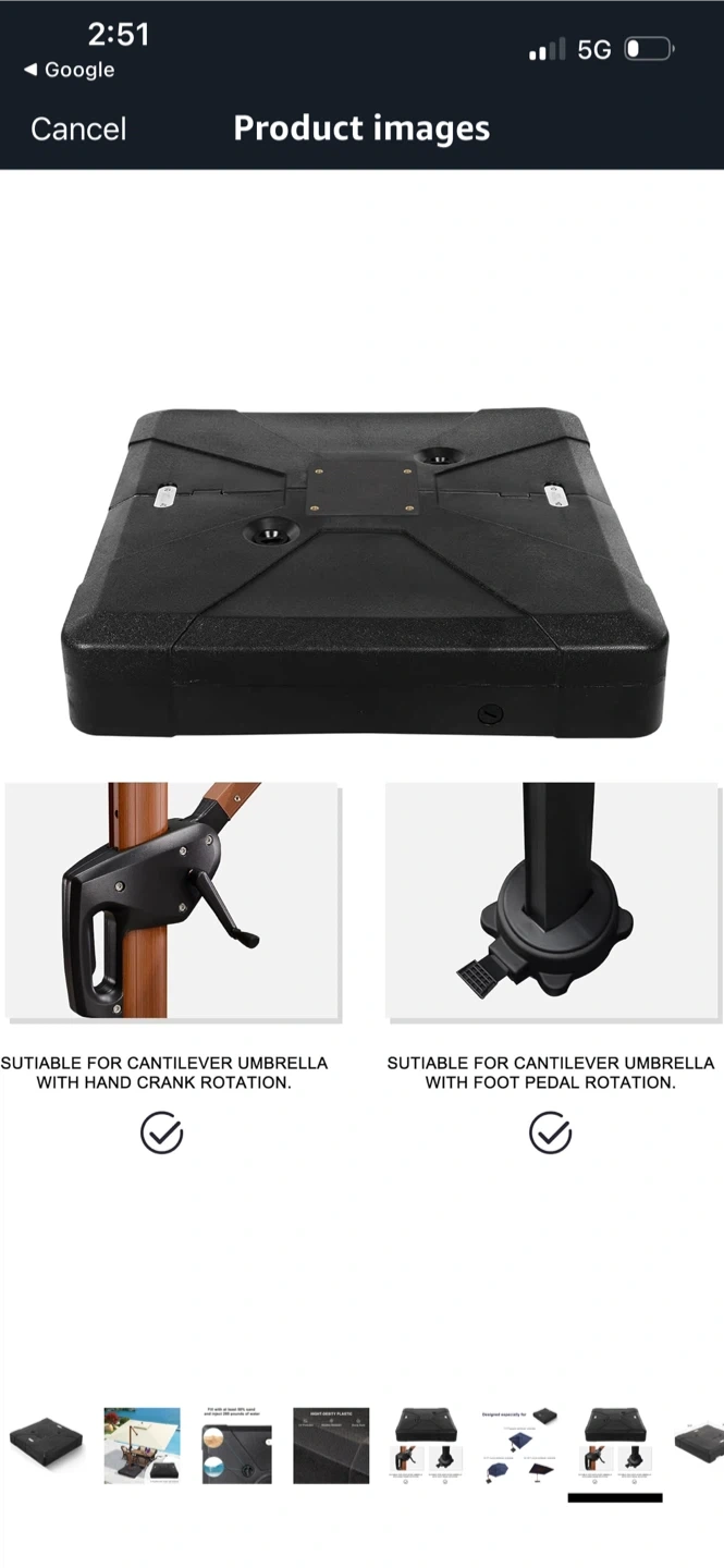 This patio umbrella base is ready to keep your outdoor space shaded and stylish! It measures 38.9 x 38.9 x 8 inches and can be filled with at least 50% sand and 280 pounds of water for extra stability. Made with high-density plastic, it's UV protected, weather-resistant, and has a sturdy build