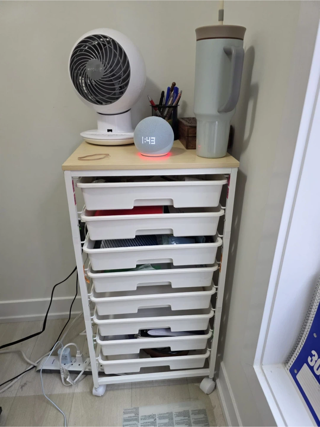 Here's a handy white rolling cart with 8 drawers! It's perfect for organizing your supplies in any room of the house. It's in great shape and ready to help you get organized