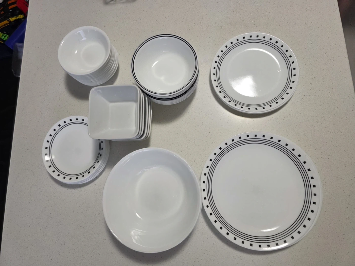 Selling a brand new Corelle Classic 16-piece dinnerware set, still in its original box! This set is known for being lightweight and durable. It includes everything you need for a service of four: dinner plates, salad plates, bowls, and mugs. Perfect for everyday use or special occasions!
