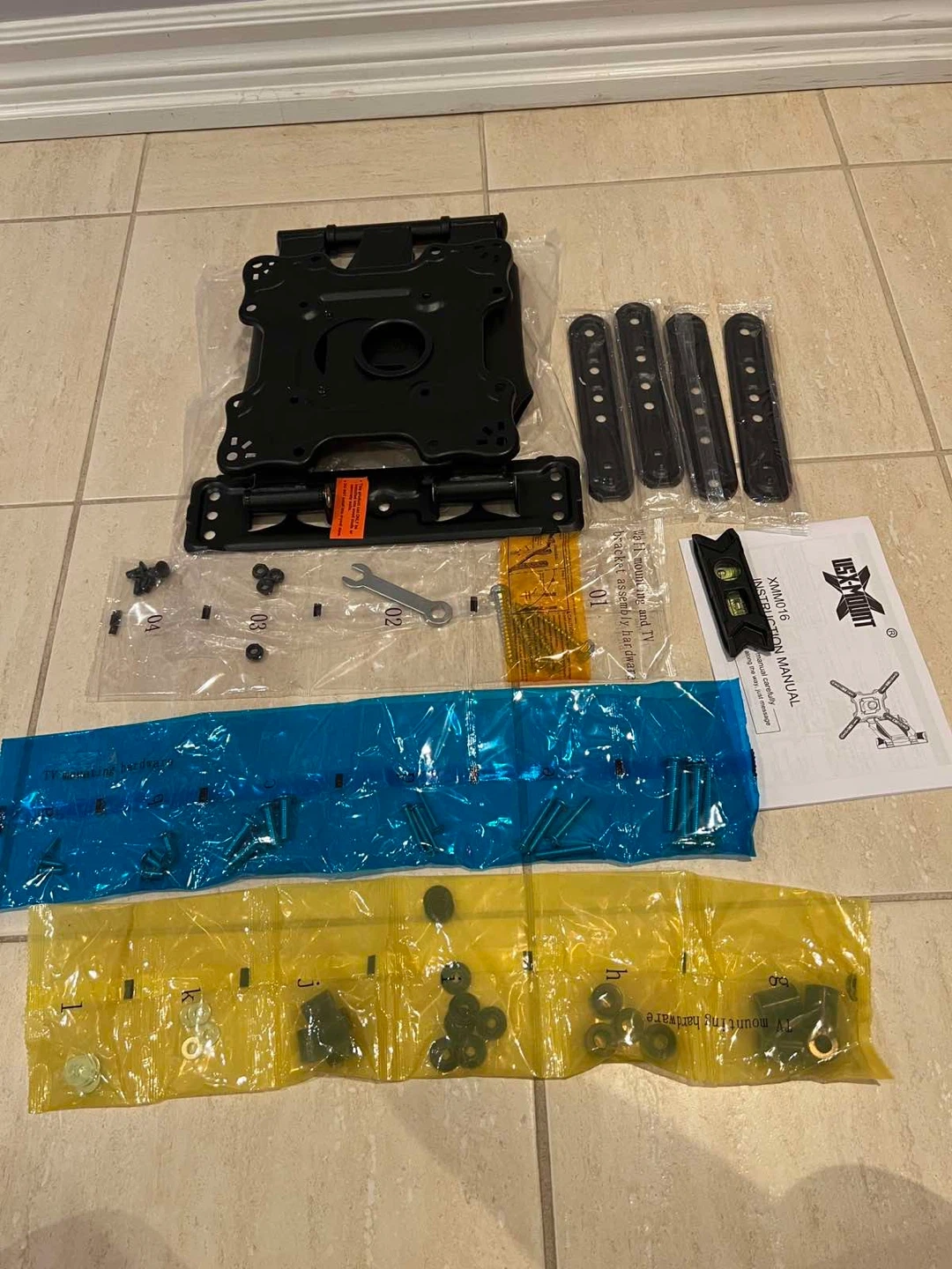 Selling a UX-Mount full motion TV wall mount in black. It appears to be in great condition. The included instruction manual shows VESA compatibility options for various TV sizes, including 100x100, 100x200, 200x100, 200x200, 200x300, 200x400, 300x200, 400x200, and 400x300