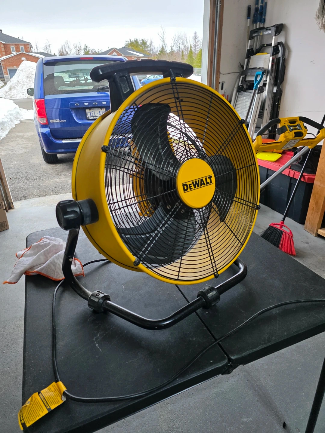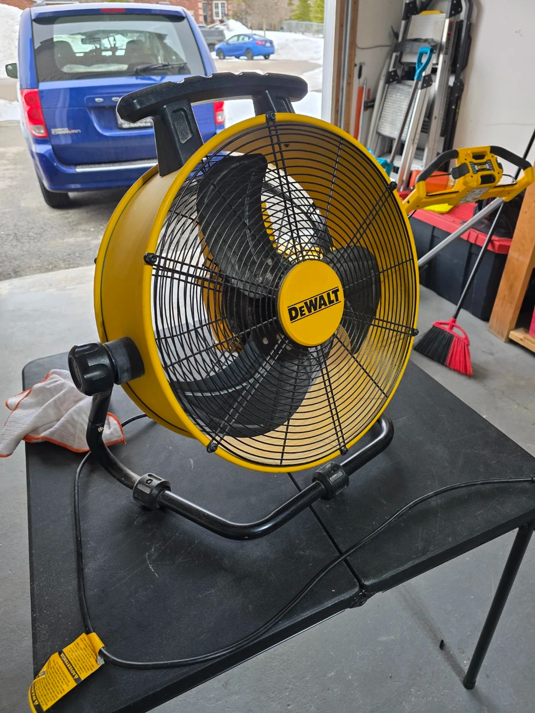 Selling a DeWalt 18" drum fan in great condition! It's yellow and black with a sturdy stand. This fan is perfect for cooling down a garage or workshop. It has three speeds to choose from!