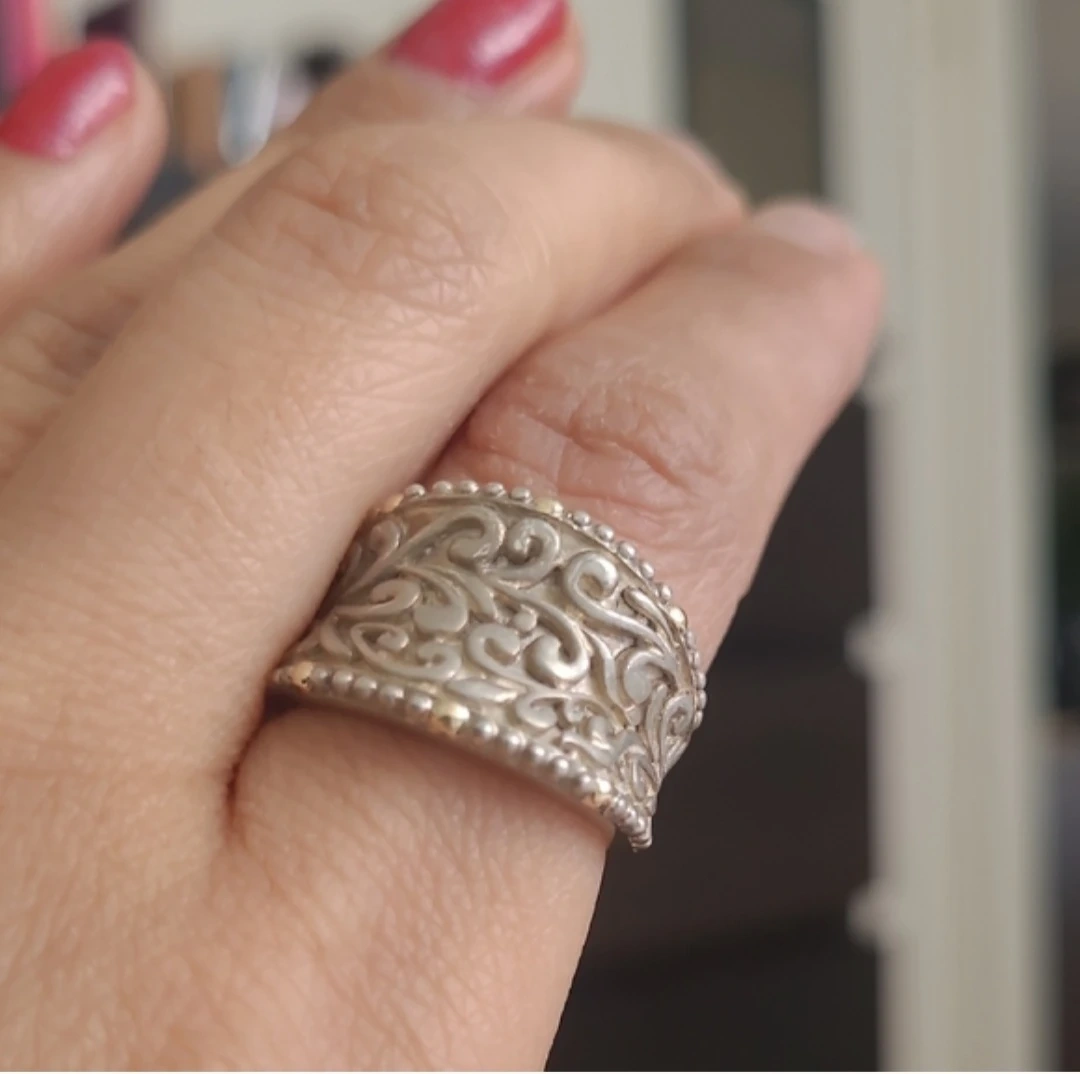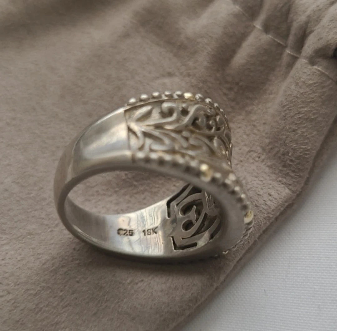 Here's a unique ring with a vintage-inspired design! It's made of sterling silver and has intricate detailing around the band. The ring is marked with '925 18K' on the inside and fits comfortably. It's around 6.5/7 size wise.