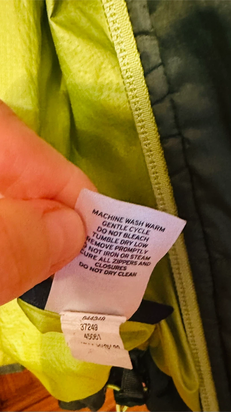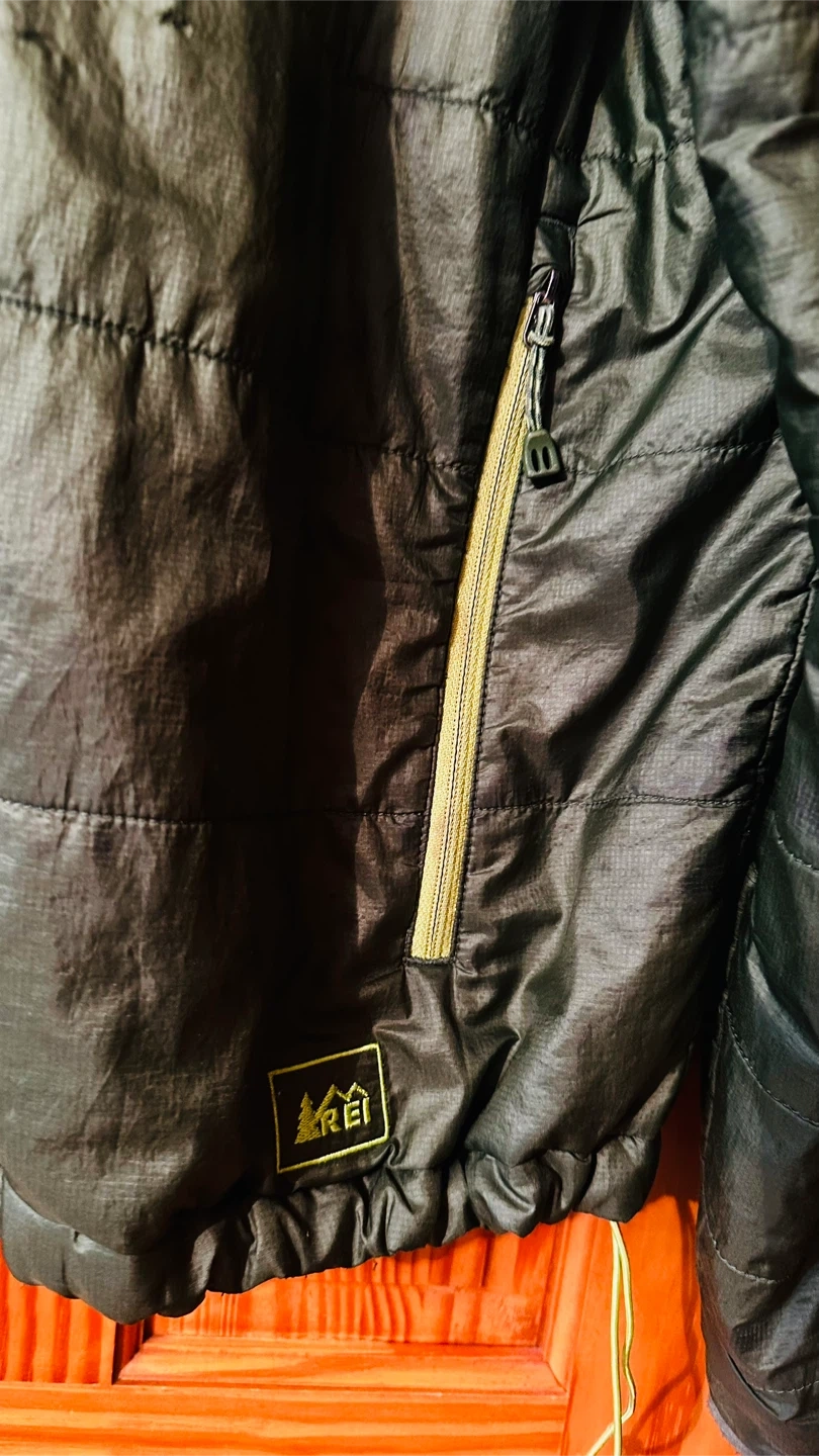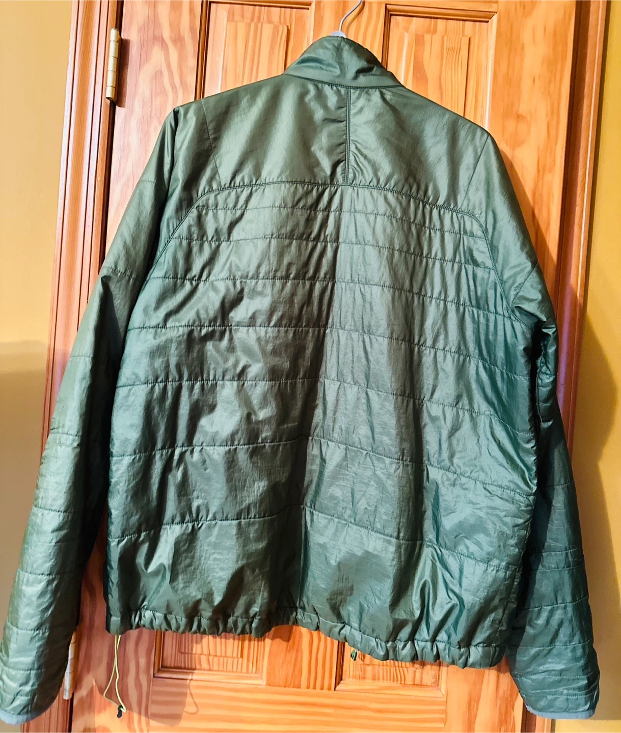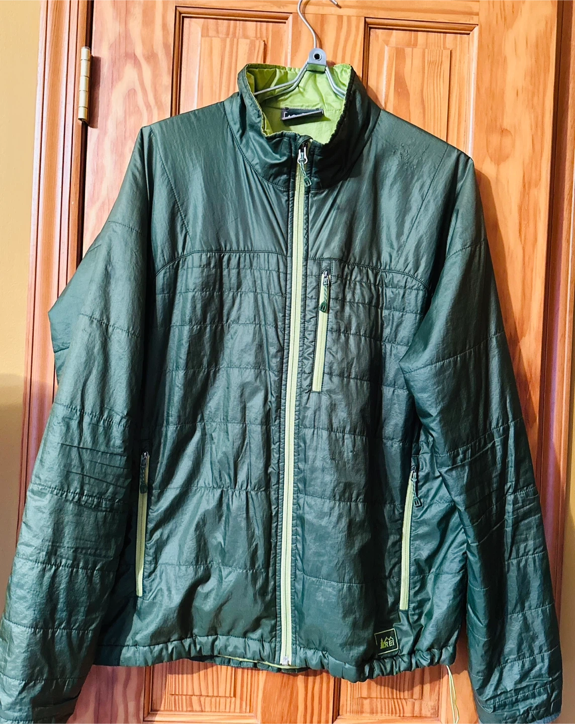 Selling a men's REI Co-op packable jacket in size large. It's a lightweight jacket perfect for travel or outdoor activities. The jacket is green with a light green interior and features a packable design for easy storage. It's in great used condition and ready for a new owner!