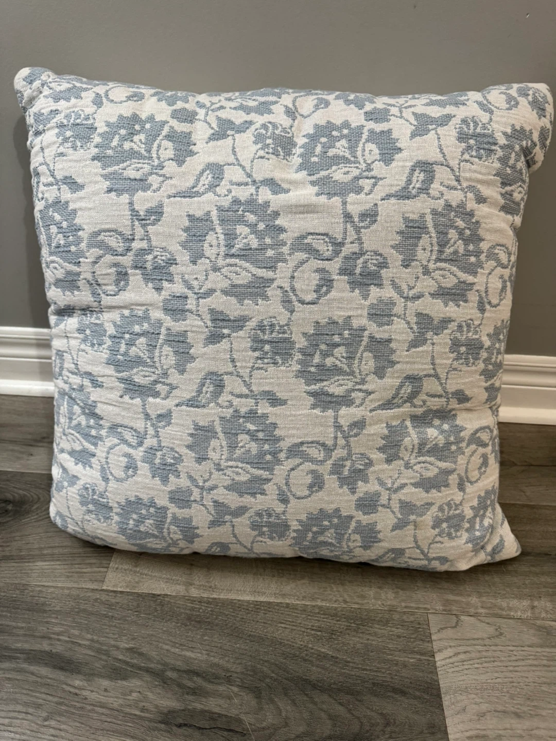 A lovely floral pattern throw pillow, perfect for adding a touch of charm to any room. The pillow features a beautiful floral design in shades of blue and white. It's in great condition and ready to brighten up your space!