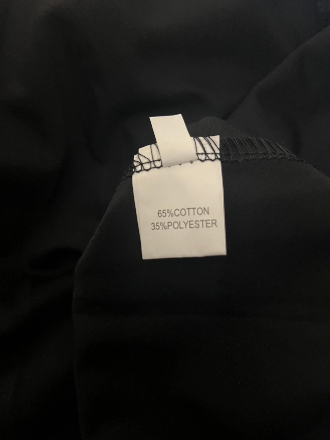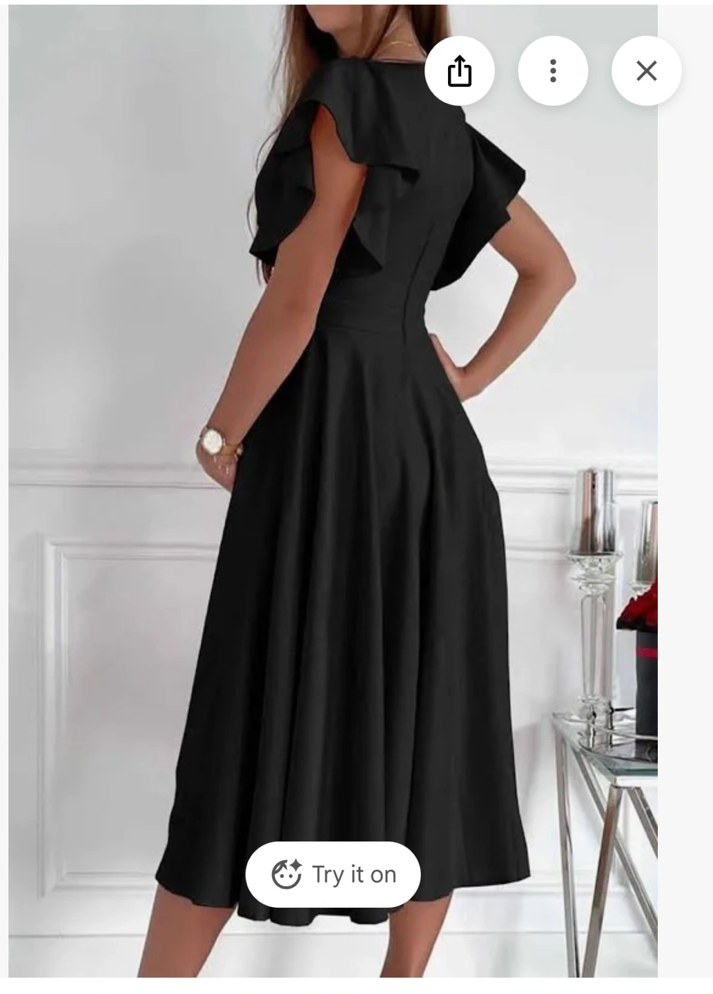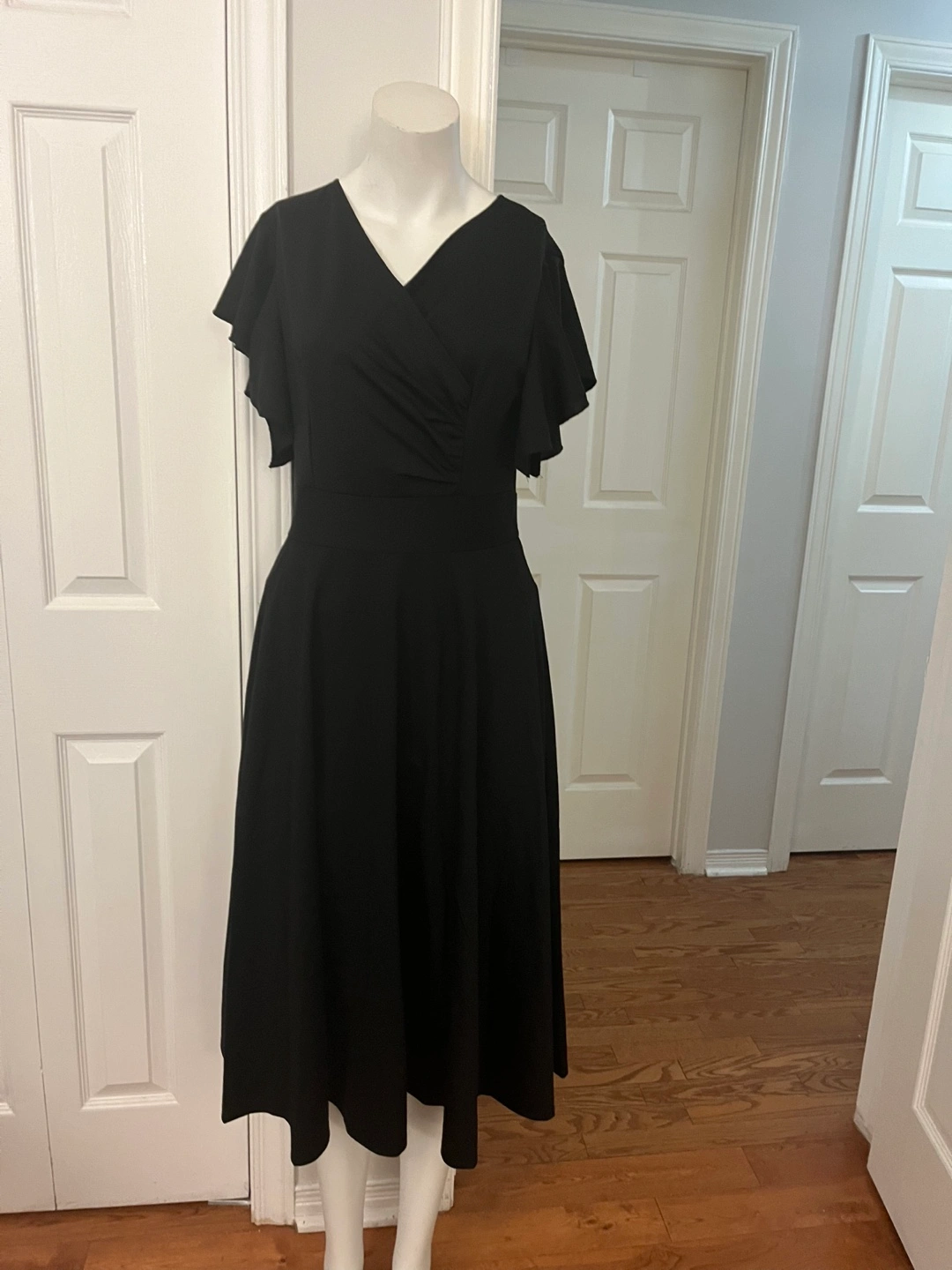 This is a lovely black midi dress with ruffle sleeves. It's made of 65% cotton and 35% polyester. Perfect for any occasion