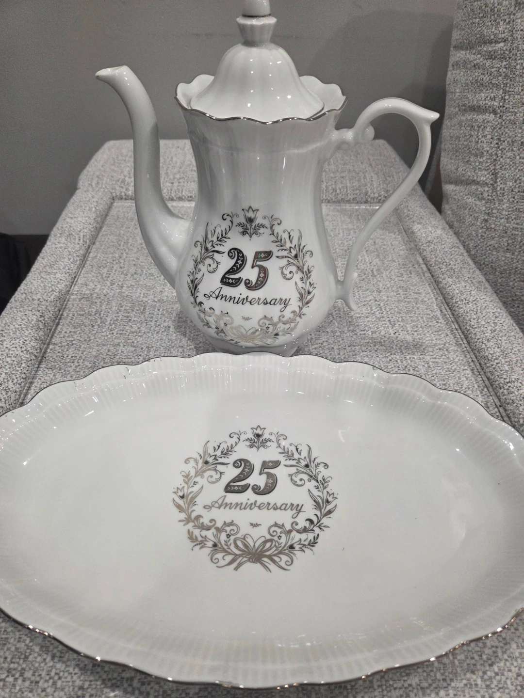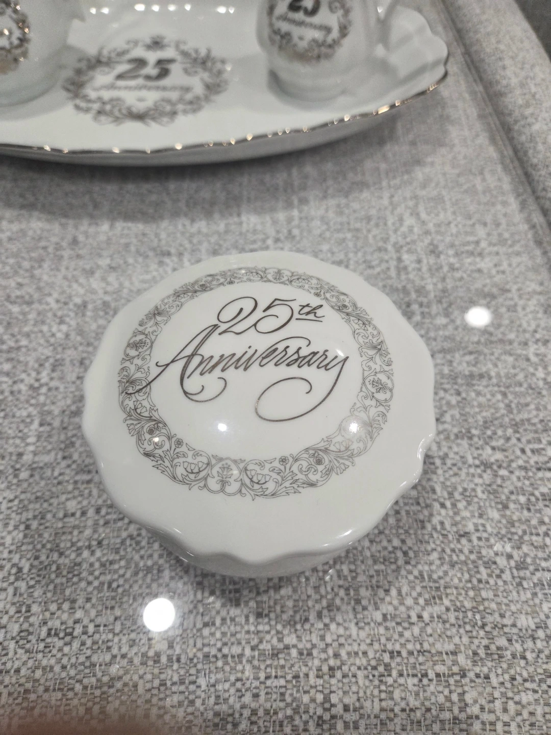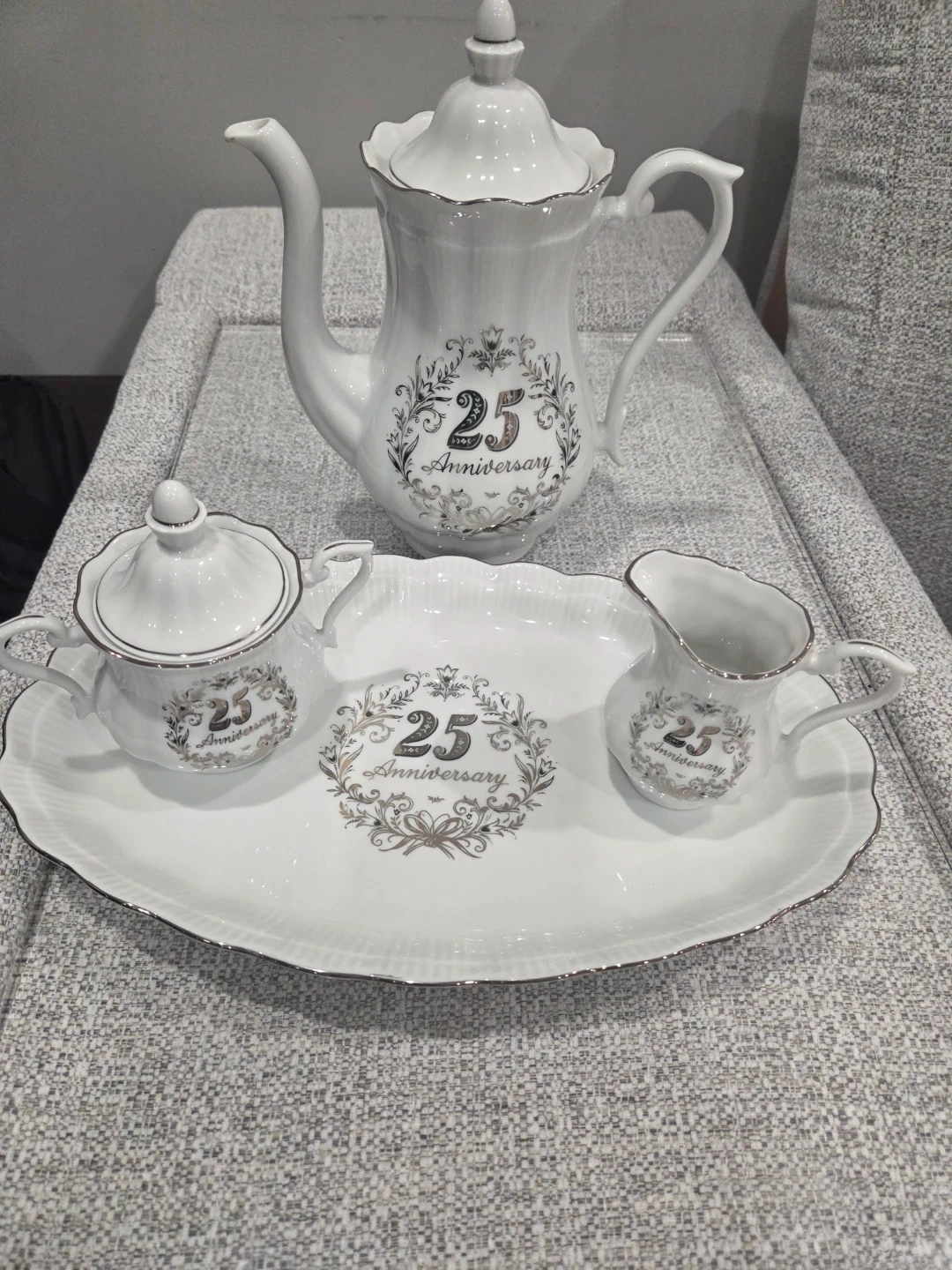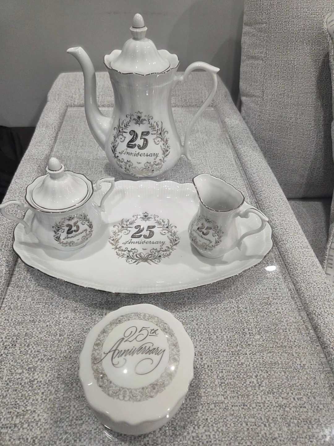 Selling a lovely white tea set, perfect for celebrating a 25th anniversary! It includes a teapot, sugar bowl, creamer, and tray. Also adding a porcelain jewelery trinket box, all adorned with a beautiful "25th Anniversary" design.