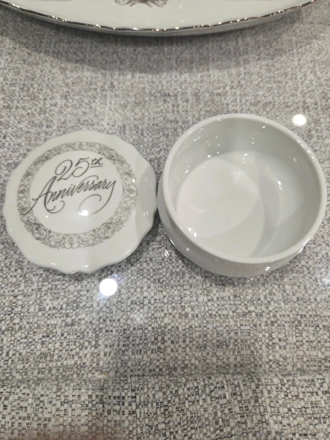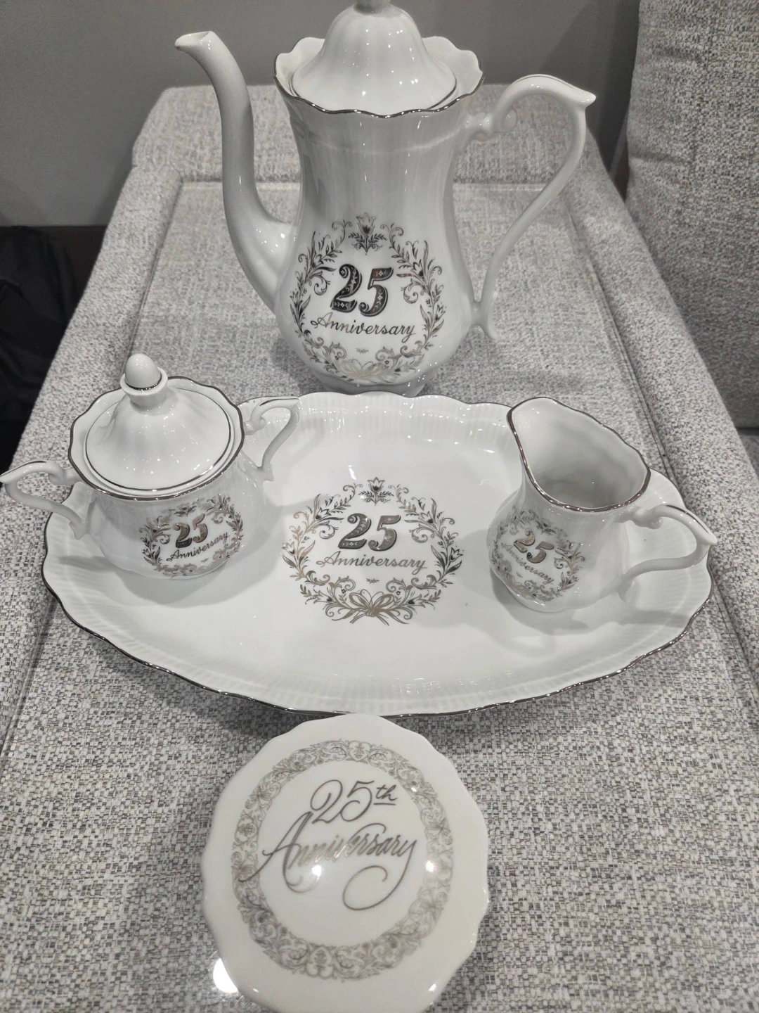 Selling a lovely white tea set, perfect for celebrating a 25th anniversary! It includes a teapot, sugar bowl, creamer, and tray. Also adding a porcelain jewelery trinket box, all adorned with a beautiful "25th Anniversary" design.