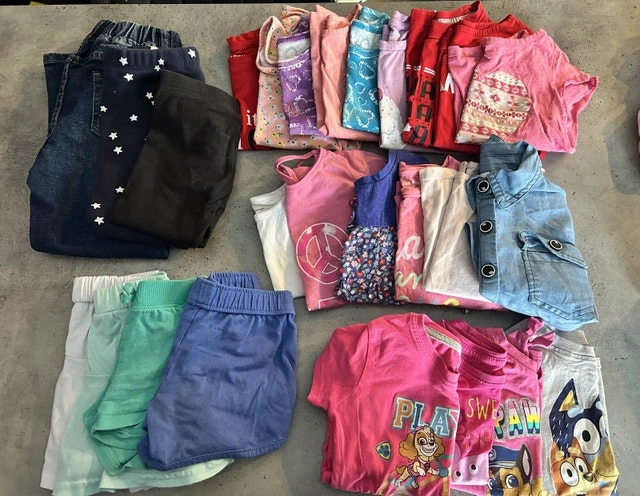 T-shirts, pants, shorts/skirts, long sleeve shirts, sweaters, dresses/overalls, undies, bathing suit, and undershirts. All in good quality. Some never worn or worn only a few times.