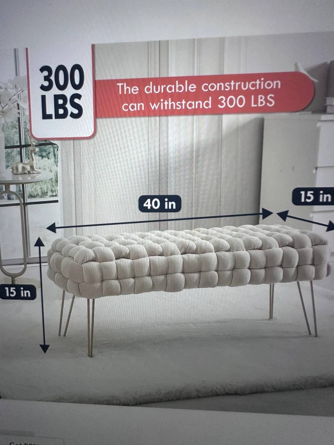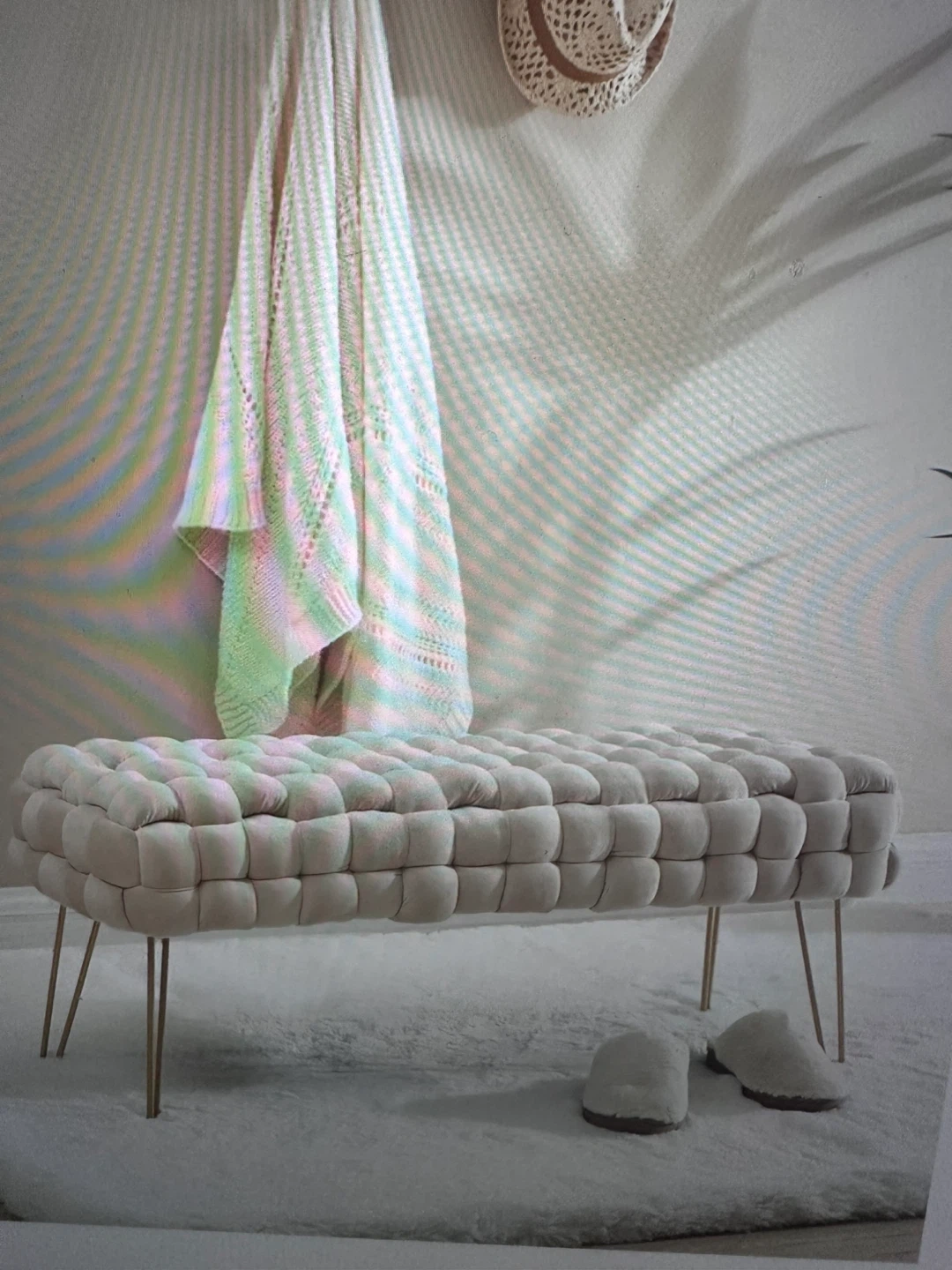 Beige Tufted Bench with Gold Legs