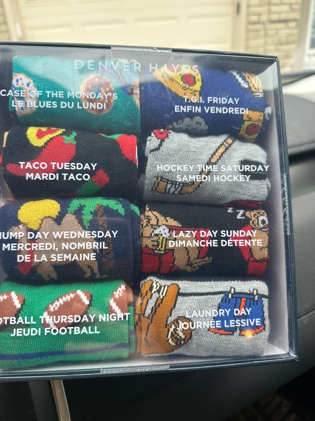 Selling a set of Denver Hayes socks, perfect for adding some fun to your week! This set includes 8 pairs of crew socks, each with a unique design for every day of the week plus laundry day. The socks are made of 97% polyester and 3% spandex, ensuring a comfortable fit. They fit men's shoe sizes 7-11.5