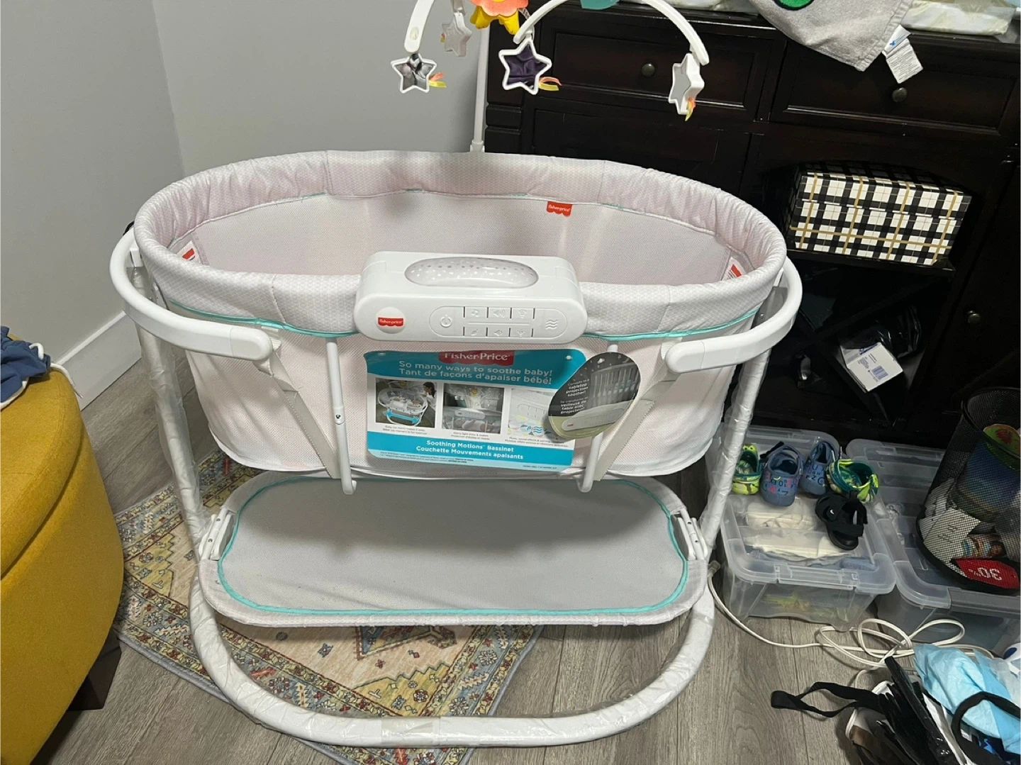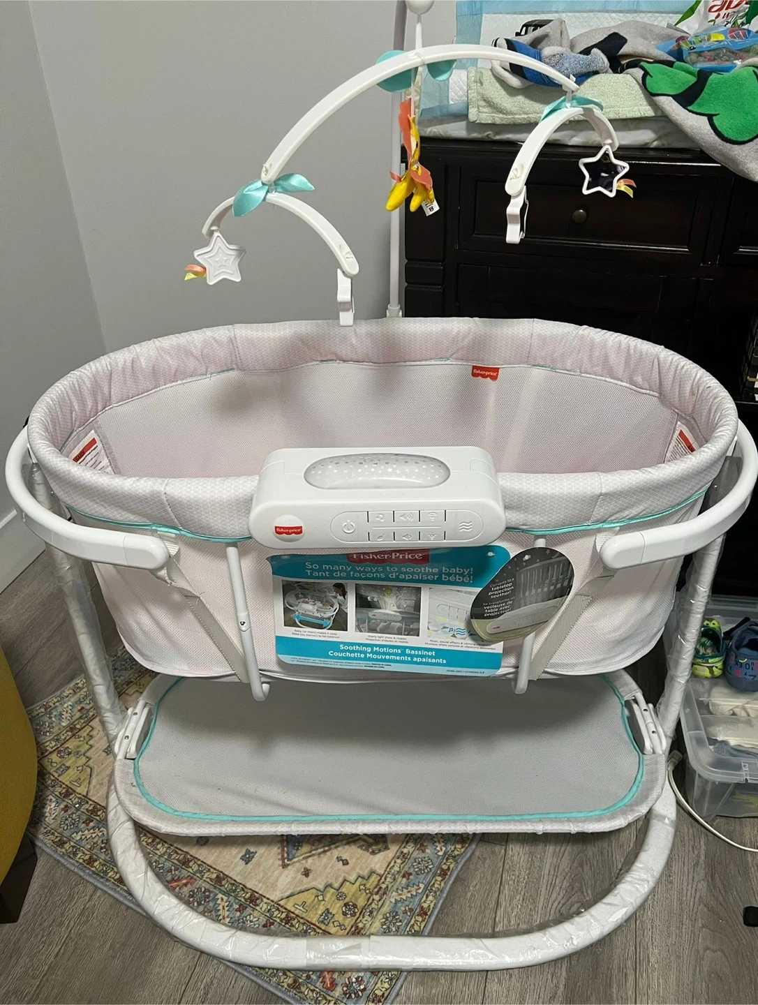Selling a Fisher-Price Soothing Motions Bassinet in great condition! This bedside sleeper has lights, music, vibrations, and a toy mobile to soothe your baby. Perfect for newborns 0+ months. Retails for $332.25