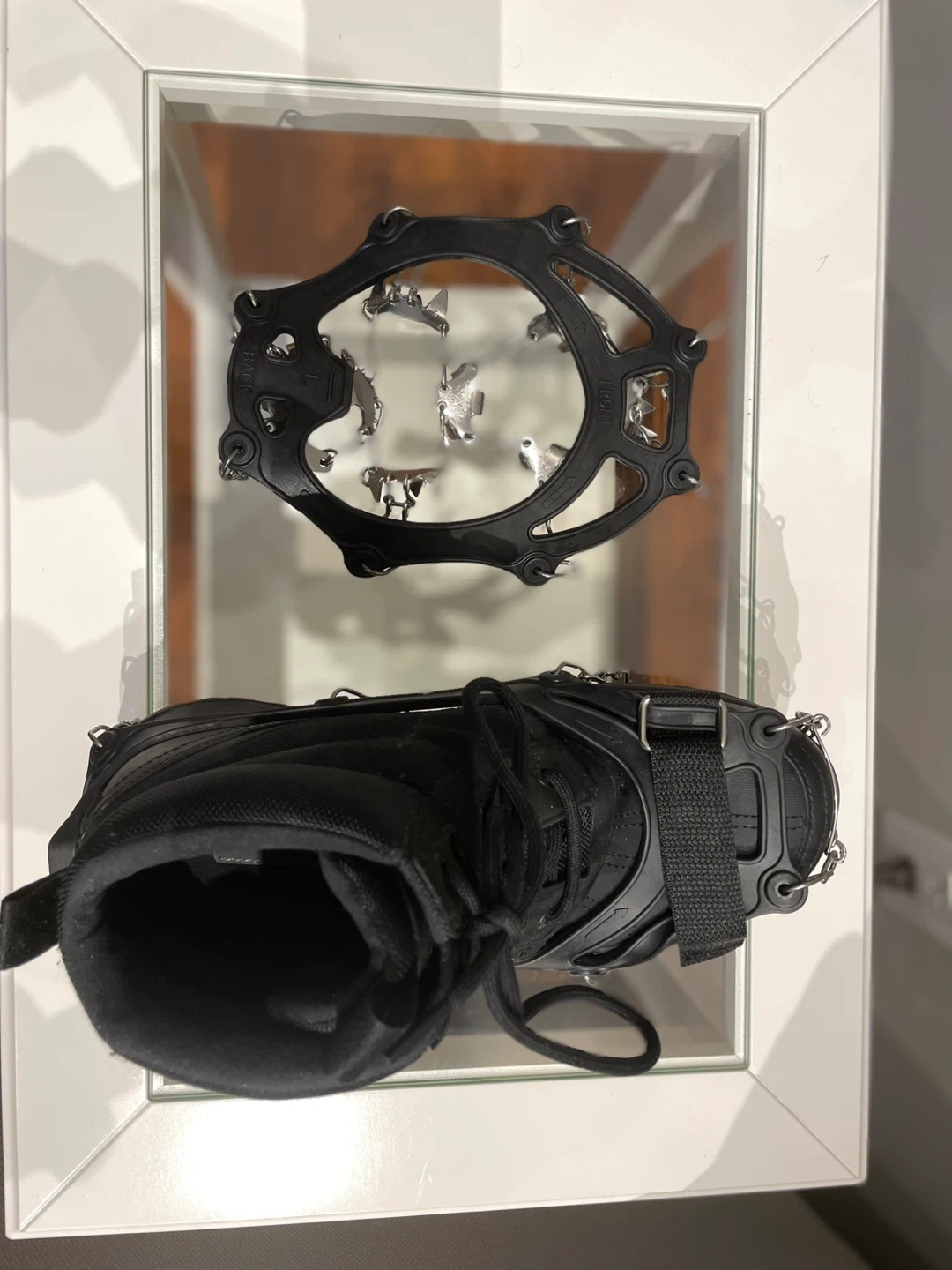 Brand new 25-spike crampons providing strong traction on ice and packed snow.
