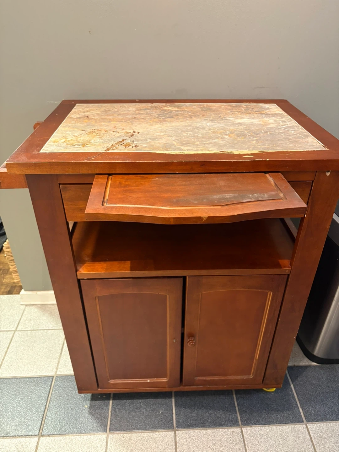 Selling a wooden kitchen cart with a marble top! It features a drawer, open shelf, and a cabinet with doors for extra storage.