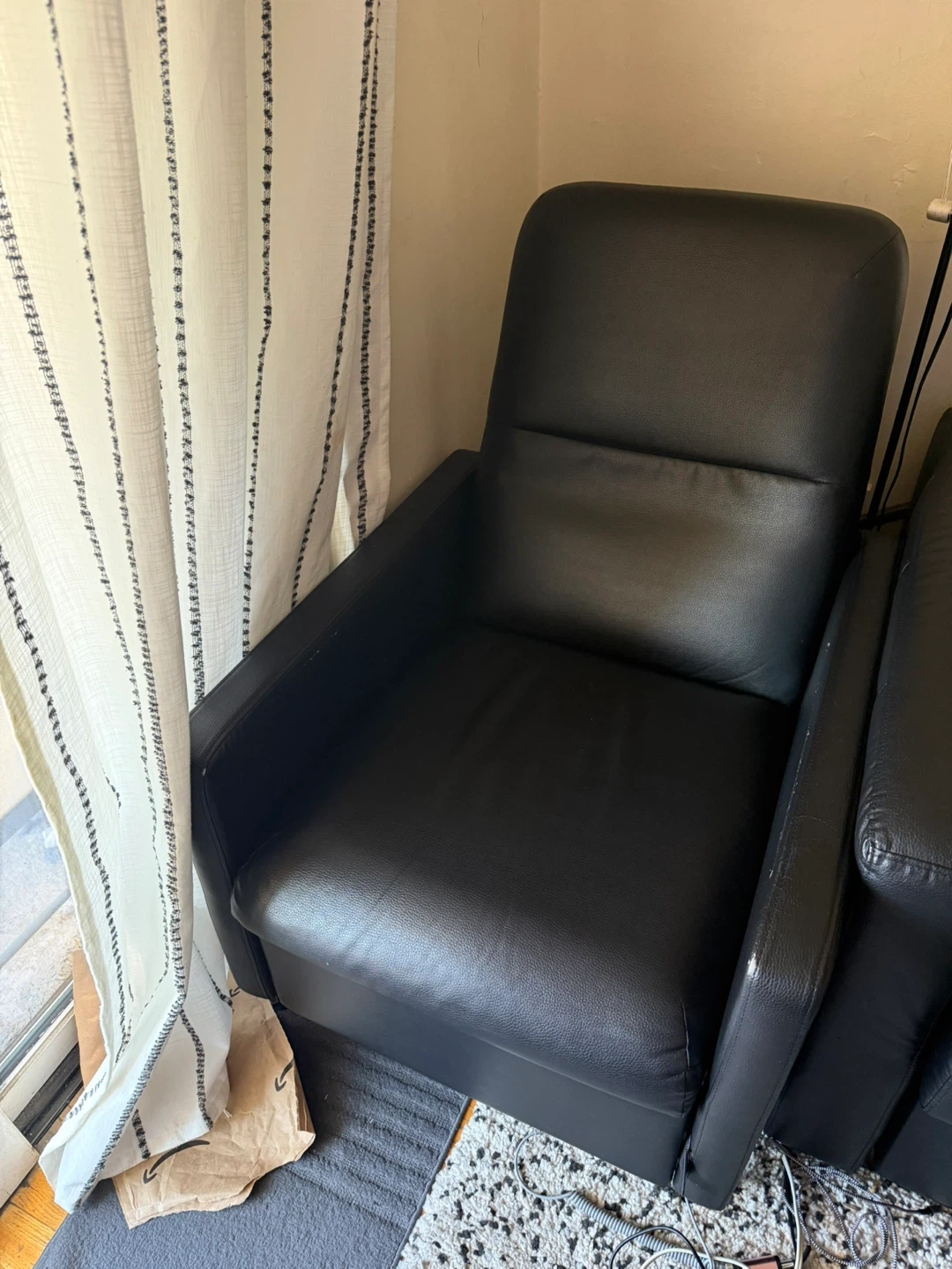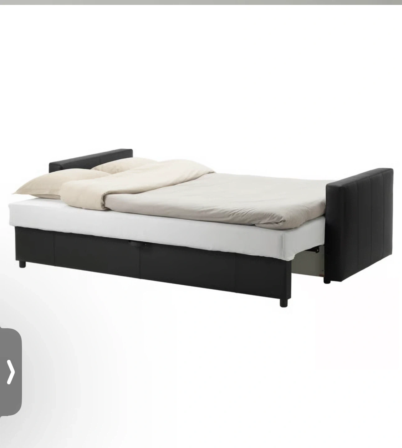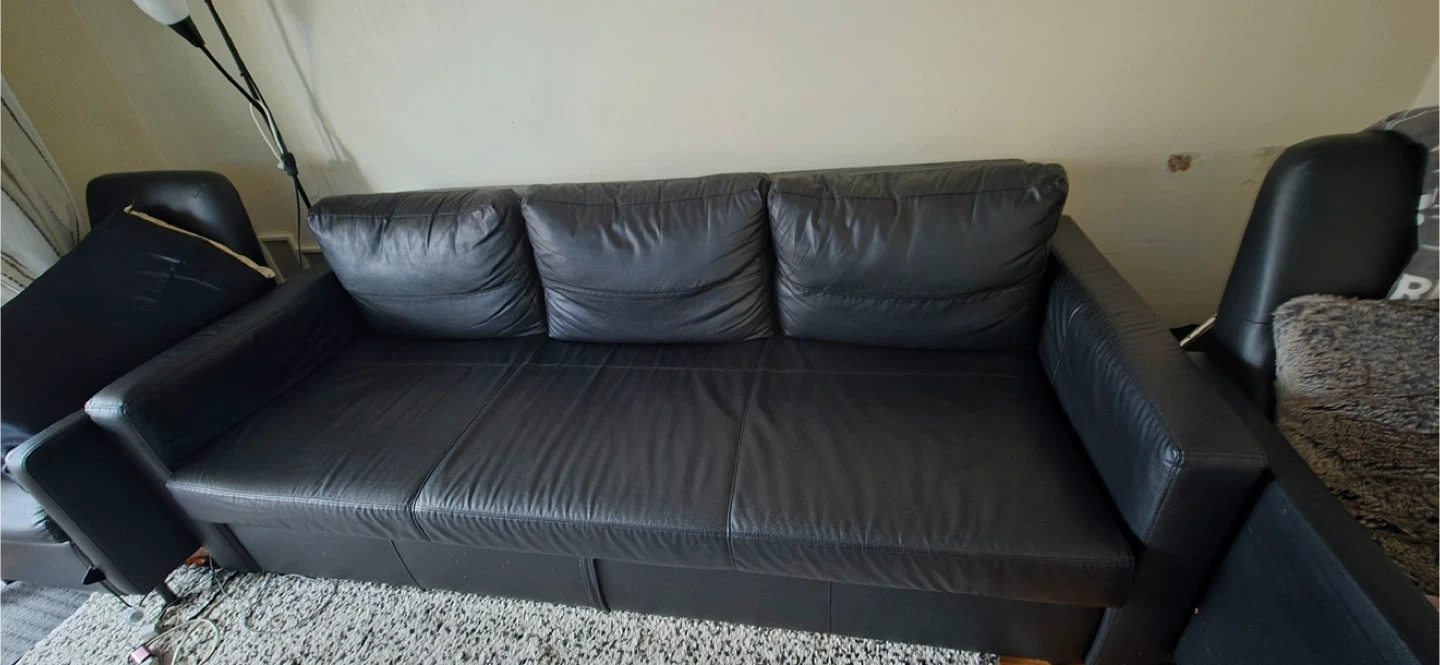 Selling a black faux leather sofa bed! It's in good condition and perfect for guests or small spaces. It easily converts from a sofa to a bed, making it super versatile, chairs Included if wanted