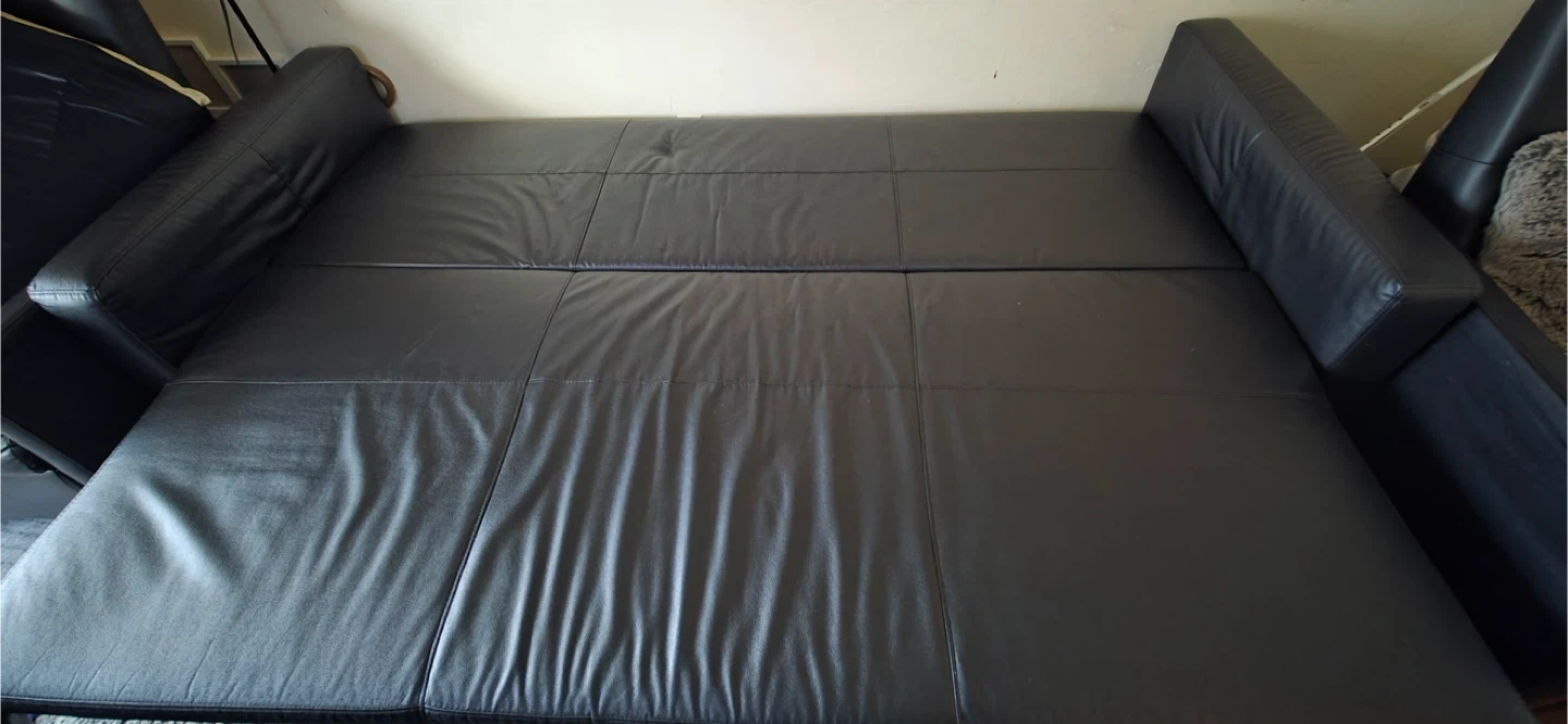Selling a black faux leather sofa bed! It's in good condition and perfect for guests or small spaces. It easily converts from a sofa to a bed, making it super versatile, chairs Included if wanted