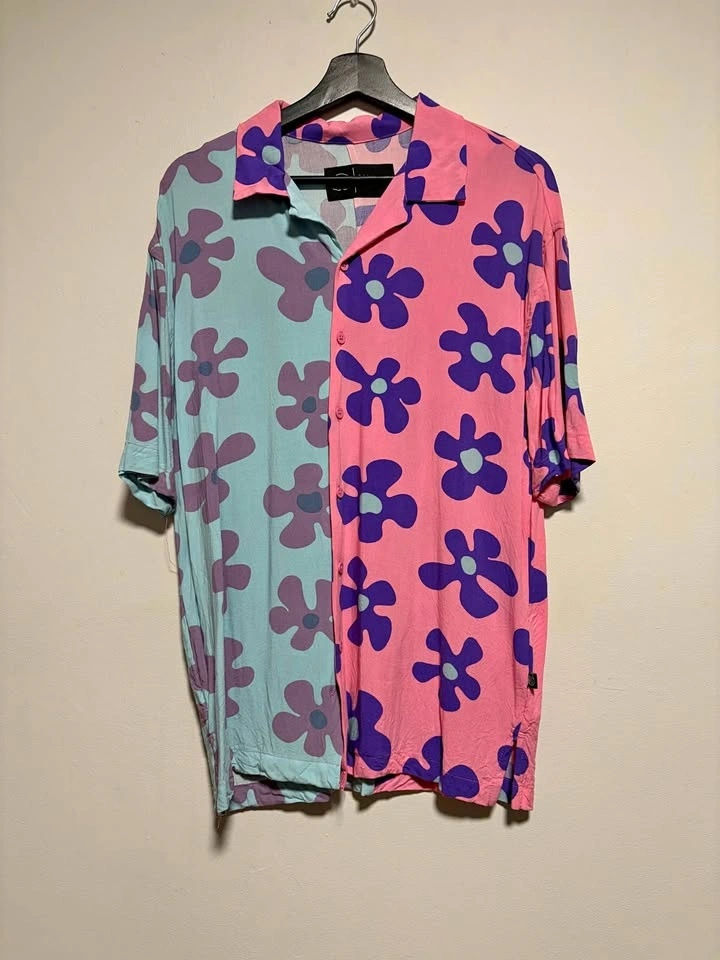 Men's short-sleeve button-up shirt. Pink and teal colour-block design. Floral pattern. Relaxed fit.