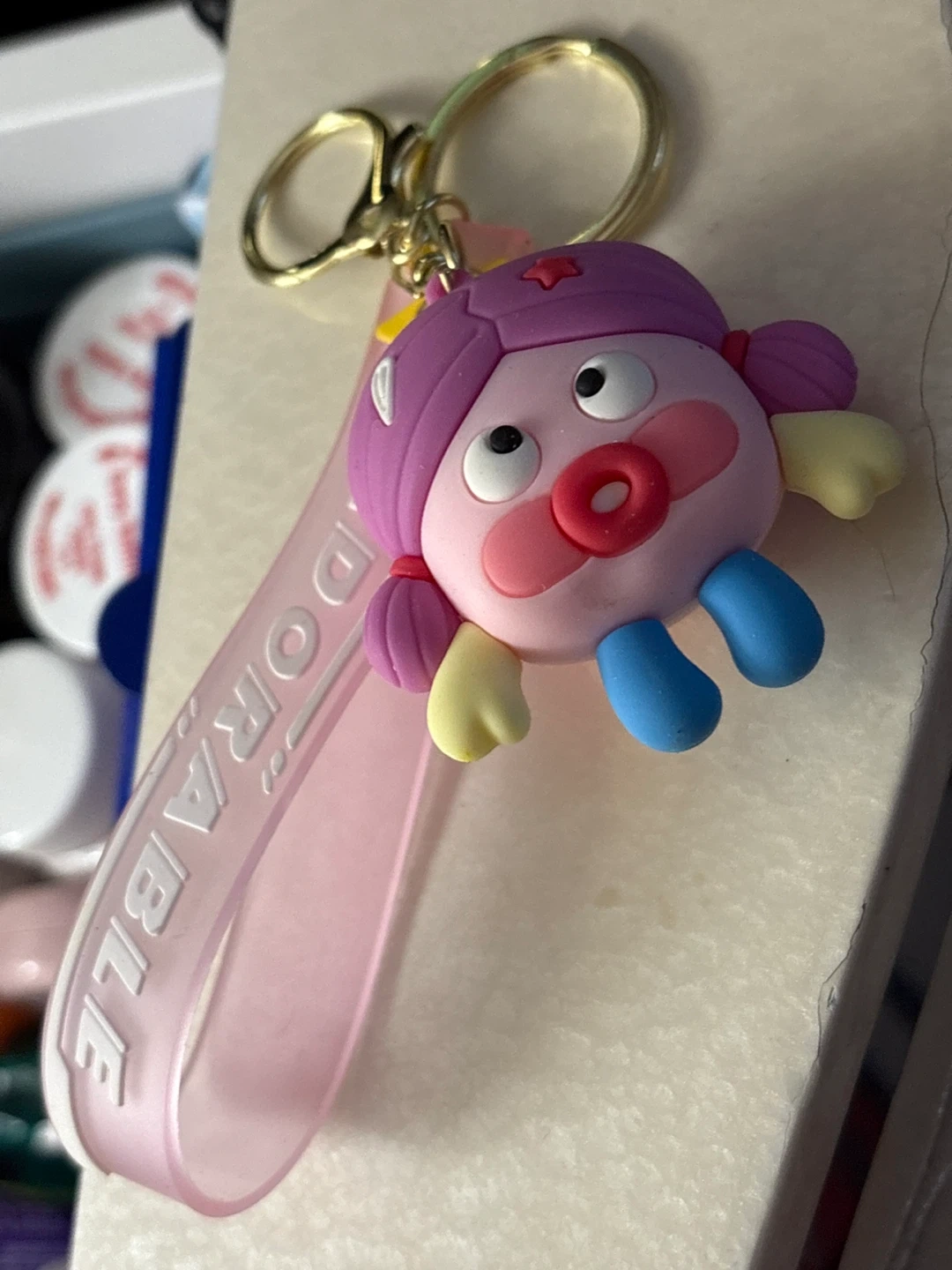 This is a cute character keychain with a pink strap that says "ADORABLE" on it!