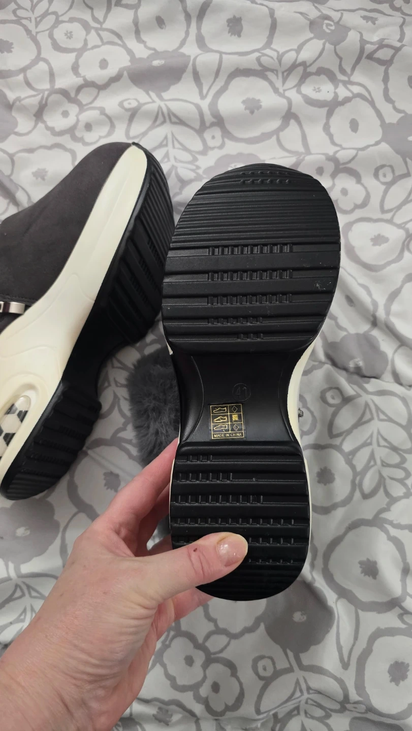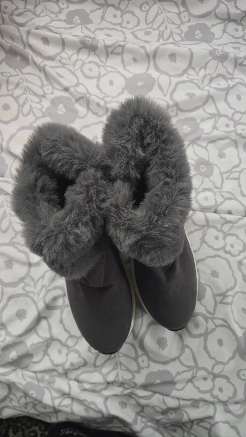 Cozy and stylish grey ankle boots with a fun fur trim! These boots are a size 41, which is about a size 10 in Canadian sizing. Perfect for adding a bit of flair to your winter outfits!