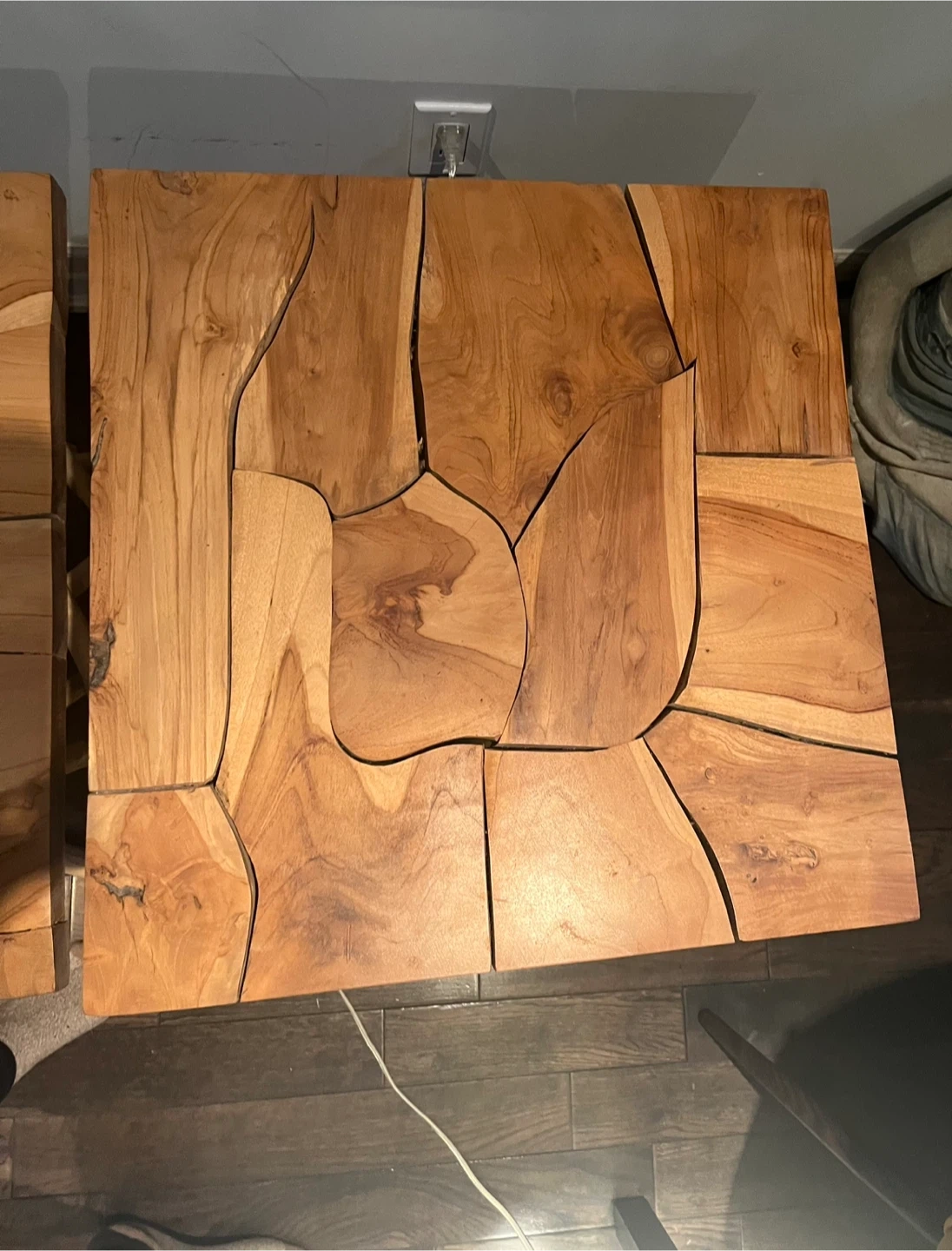 Selling a pair of wooden side tables with a unique, eye-catching design. These tables feature a natural wood finish and a distinctive base. Perfect for adding a touch of rustic charm to any room! 22" x 22" x 22" $250 for both.