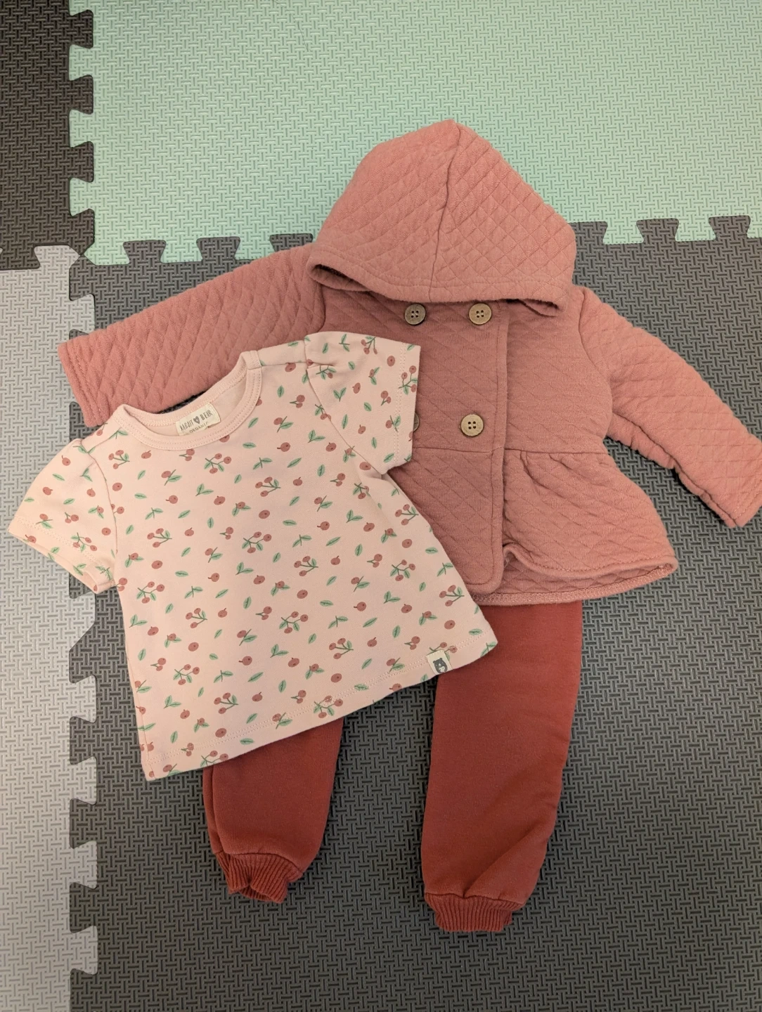 Baby fall/spring set from Rabbit + Bear in size 9-12 months. Made of organic cotton, in EUC, T-shirt never worn, jacket and pants worn once.