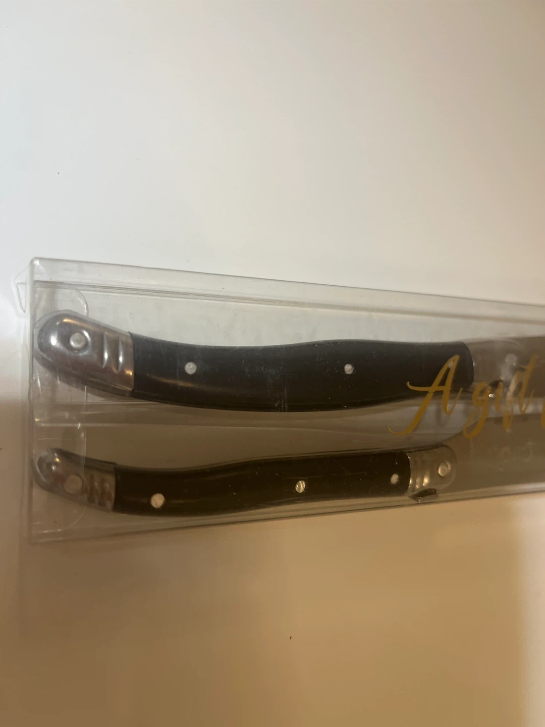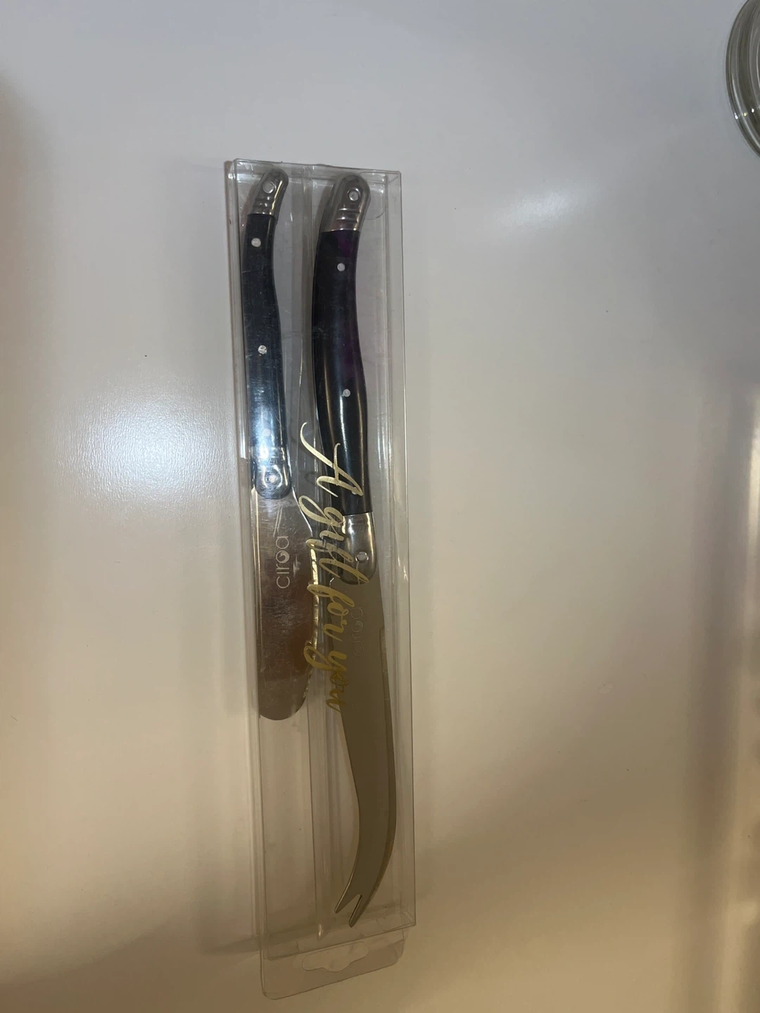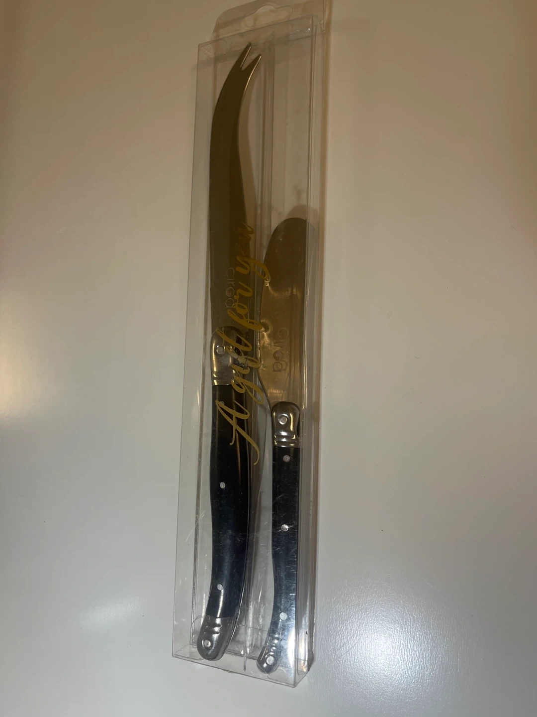 Selling a brand new Circa Laguiole cheese knife set! It comes in the original box and includes two knives perfect for serving cheese at your next gathering. The knives have a sleek design that will look great on any cheese board