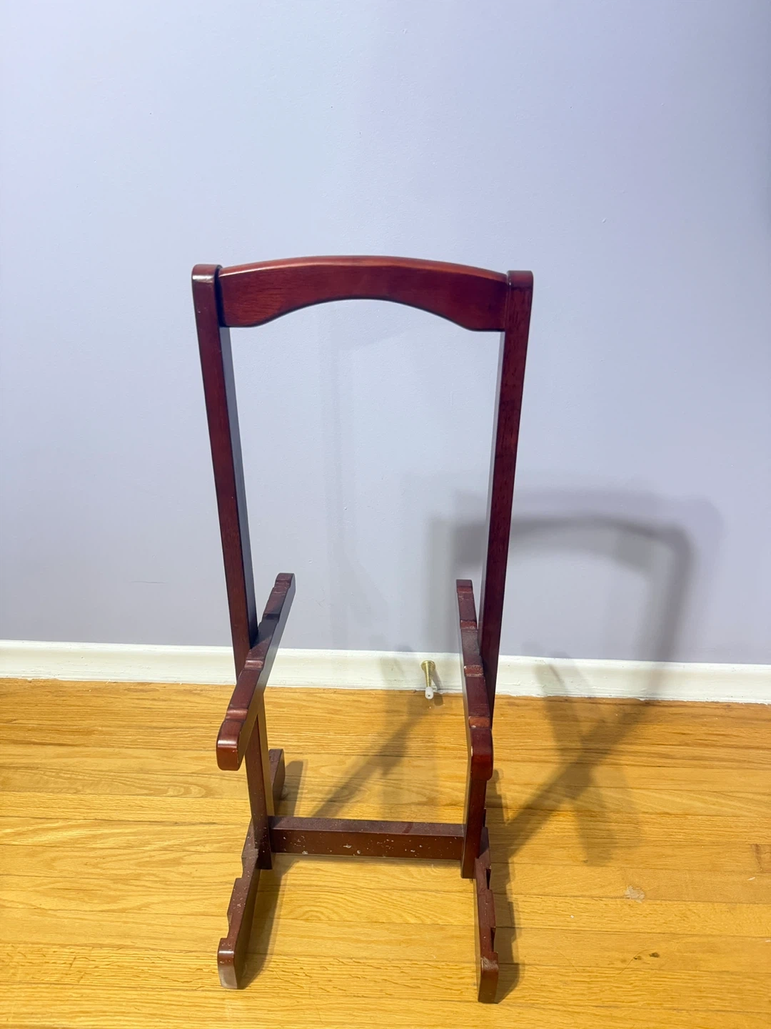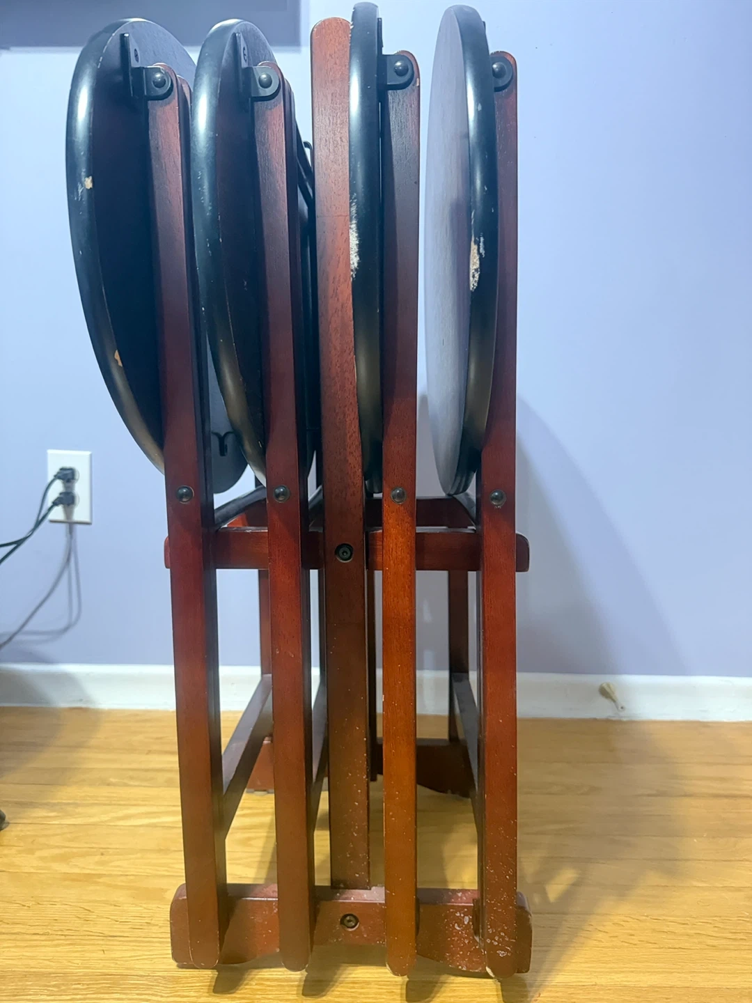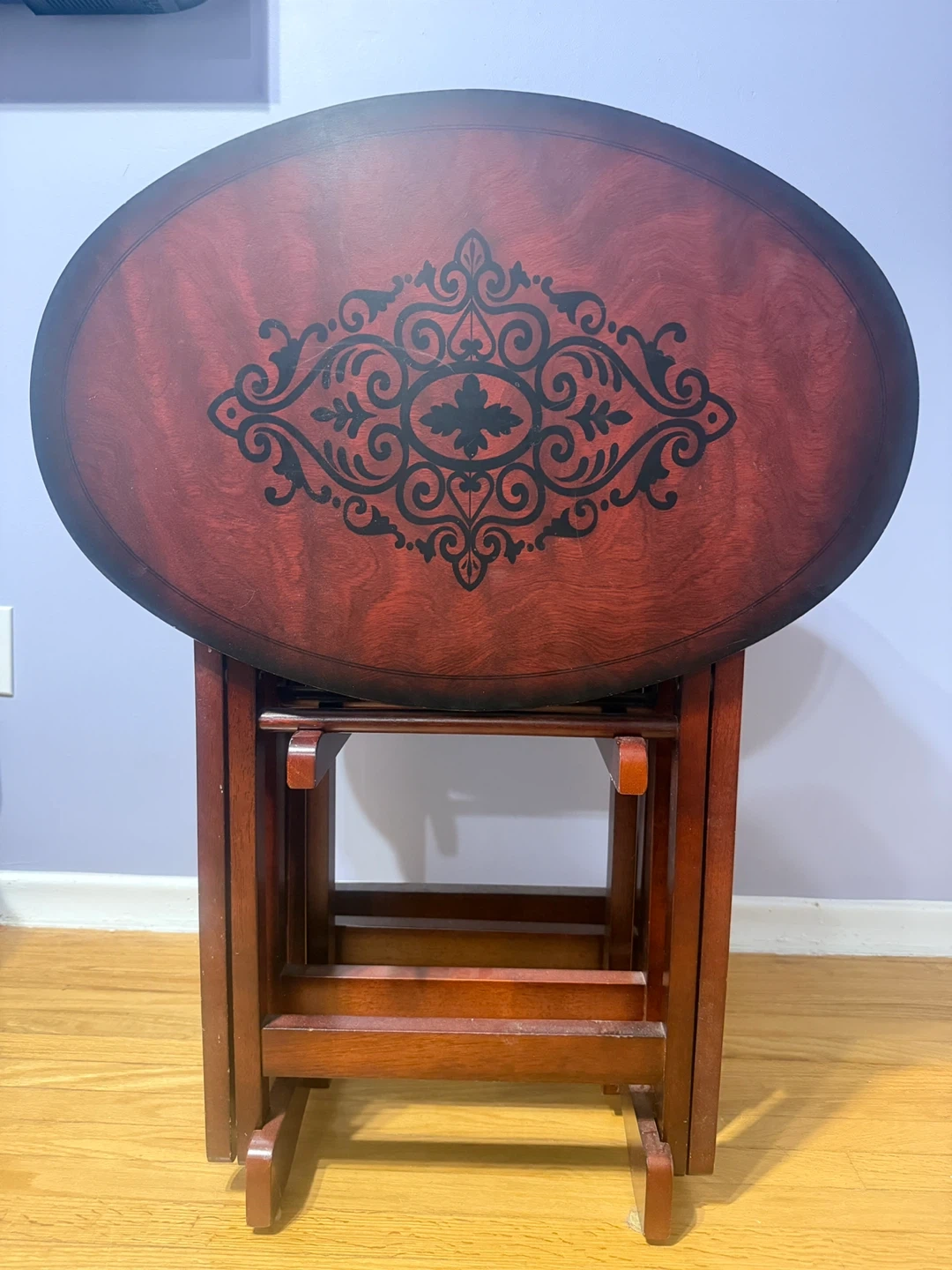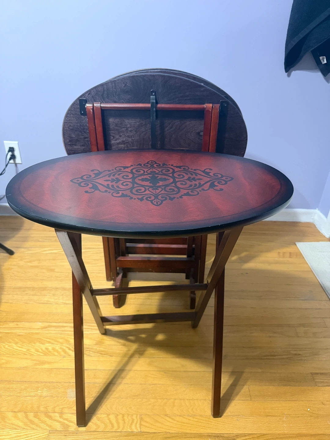 Selling a set of 4 folding TV tray tables. The tables are in good condition and feature a dark wood finish with a decorative design on top. They fold up neatly for easy storage, perfect for small spaces or when you need extra table space!