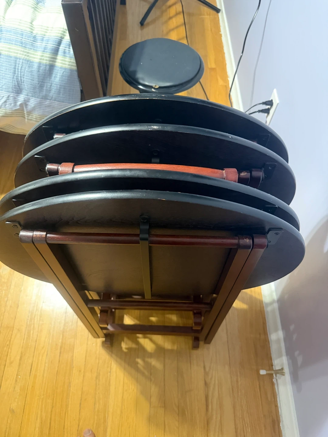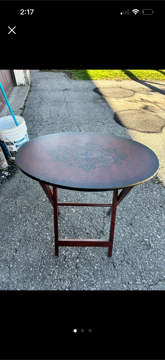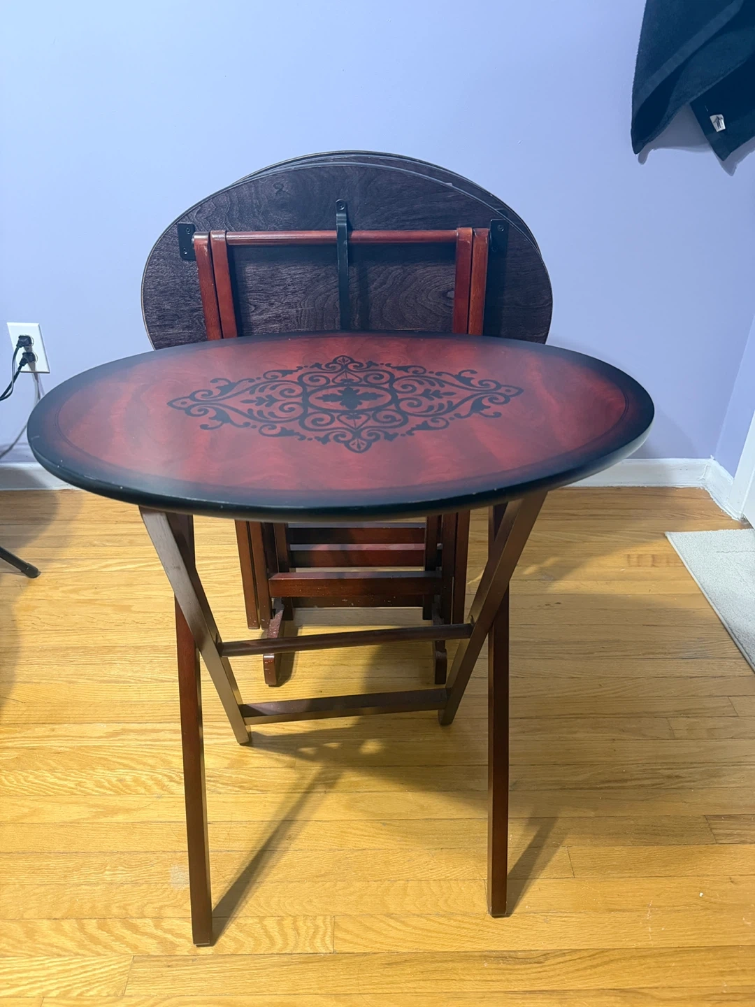 Selling a set of 4 folding TV tray tables. The tables are in good condition and feature a dark wood finish with a decorative design on top. They fold up neatly for easy storage, perfect for small spaces or when you need extra table space!