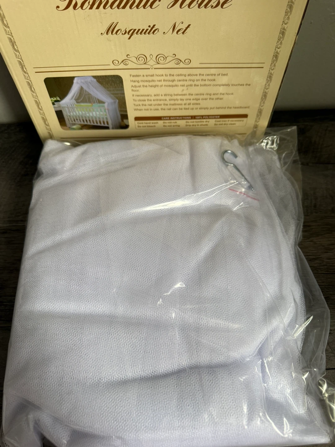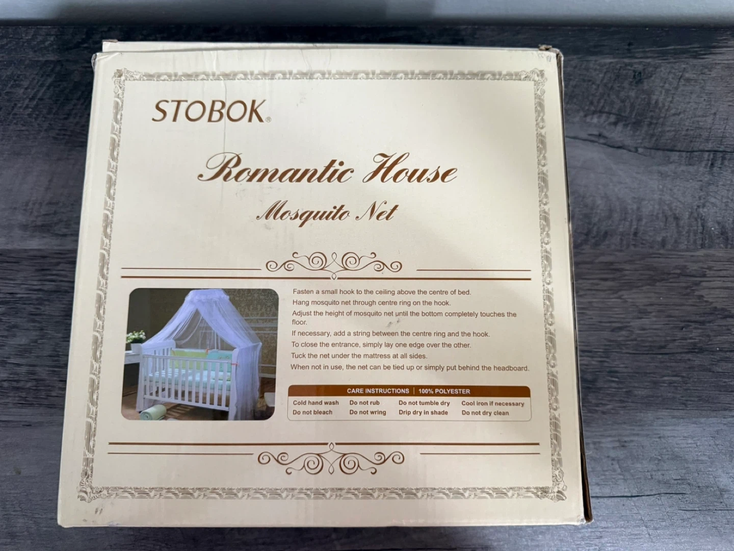 Selling a brand new STOBOK Romantic House Mosquito Net, still in its original packaging! This mosquito net is made of 100% polyester and is designed to hang above a baby's bed. It adds a touch of elegance while protecting your little one from mosquitoes and other insects. The box includes care instructions for easy maintenance.