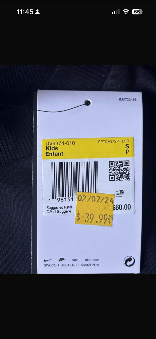 This is a Nike kids' sweatshirt in size S. It features the Nike logo on the front. The suggested retail price was $60.00, but it was on sale for $39.99. The style number is DV9374-010.
