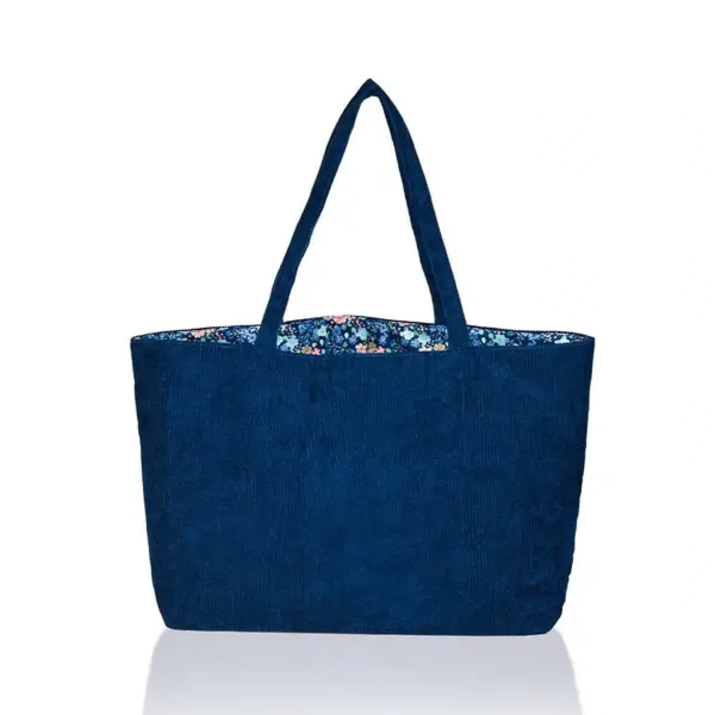 This navy blue reversible velvet bag is designed to adapt to your style. It's crafted from soft corduroy velvet and features a delicate floral motif lining when reversed, offering two looks in one. It’s spacious enough for everyday essentials while remaining refined and effortless.