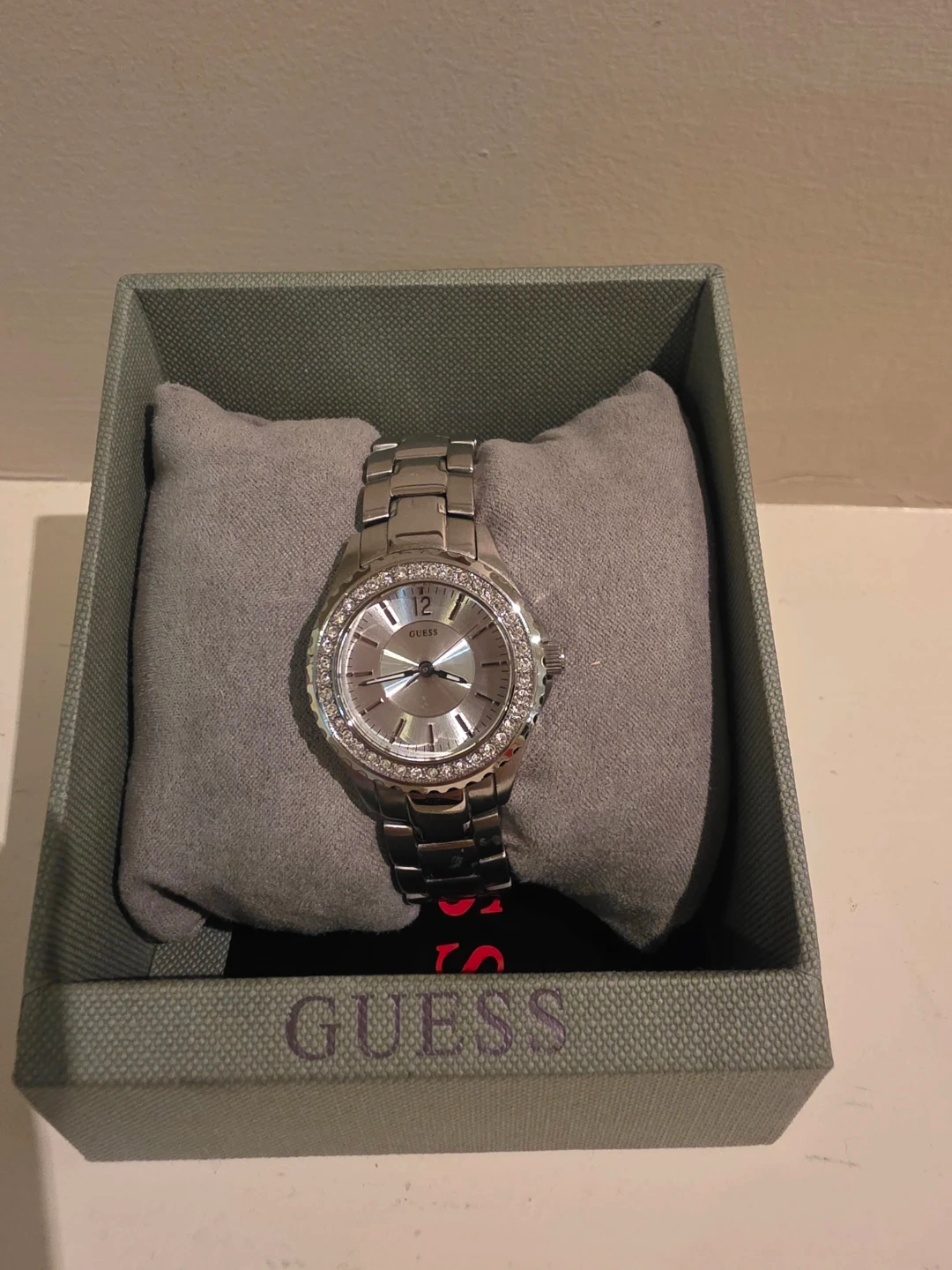 Selling a beautiful Guess women's watch in silver tone. It features a crystal-accented bezel and a sleek design. Making it a perfect gift or treat for yourself