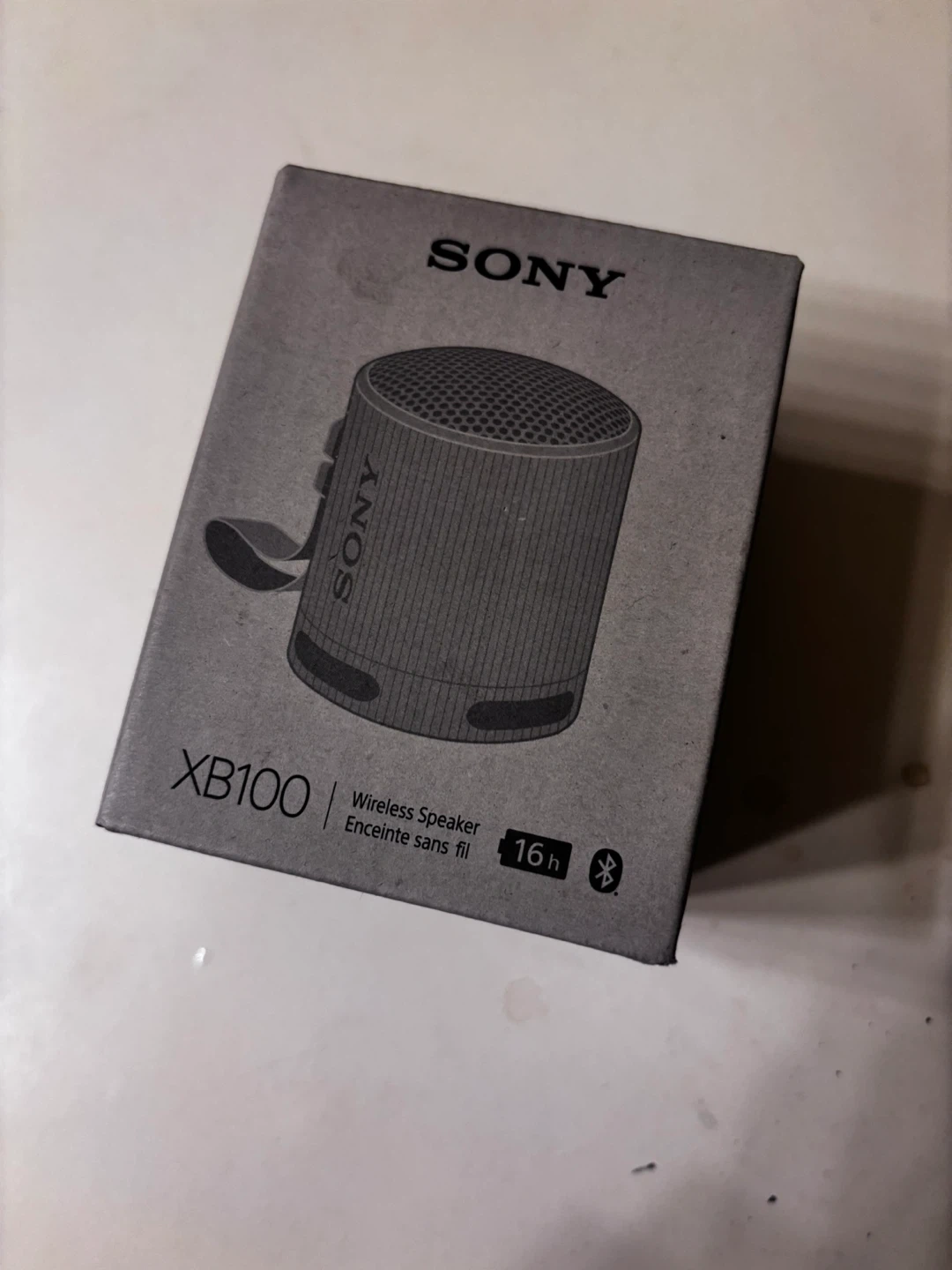 Selling a brand new Sony XB100 wireless speaker in light gray! It comes in its original box. This speaker offers up to 16 hours of battery life and is compatible with both iPhone and Android devices. Made in Vietnam, it connects via USB-Type C.