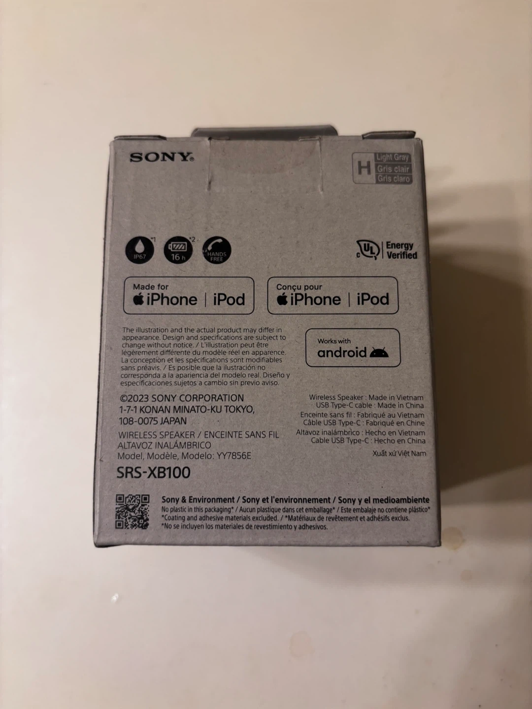 Selling a brand new Sony XB100 wireless speaker in light gray! It comes in its original box. This speaker offers up to 16 hours of battery life and is compatible with both iPhone and Android devices. Made in Vietnam, it connects via USB-Type C.