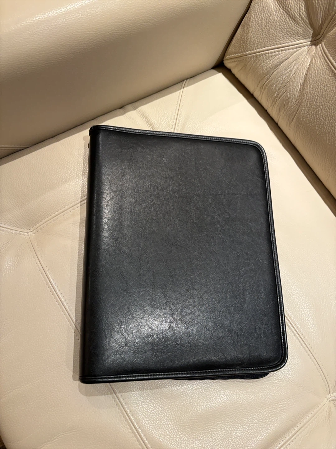Selling a black leather binder with several organizing options. It's in great condition as it was never used. Perfect for organizing documents or notes. It features a zippered closure and multiple internal pockets for added convenience.