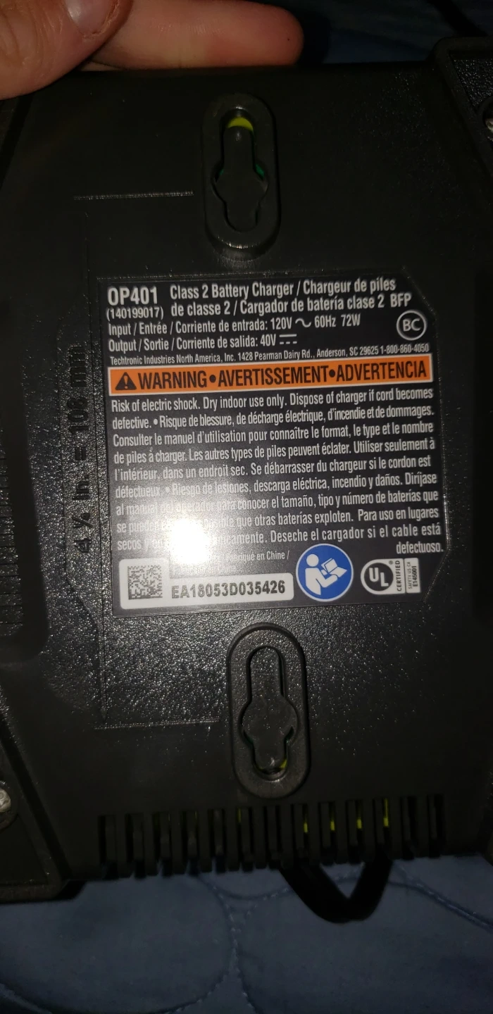 Selling a Ryobi 40V battery charger, model OP401. It's in good working condition and ready to keep your Ryobi batteries charged up for all your projects
