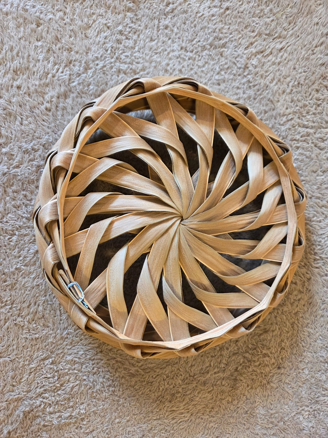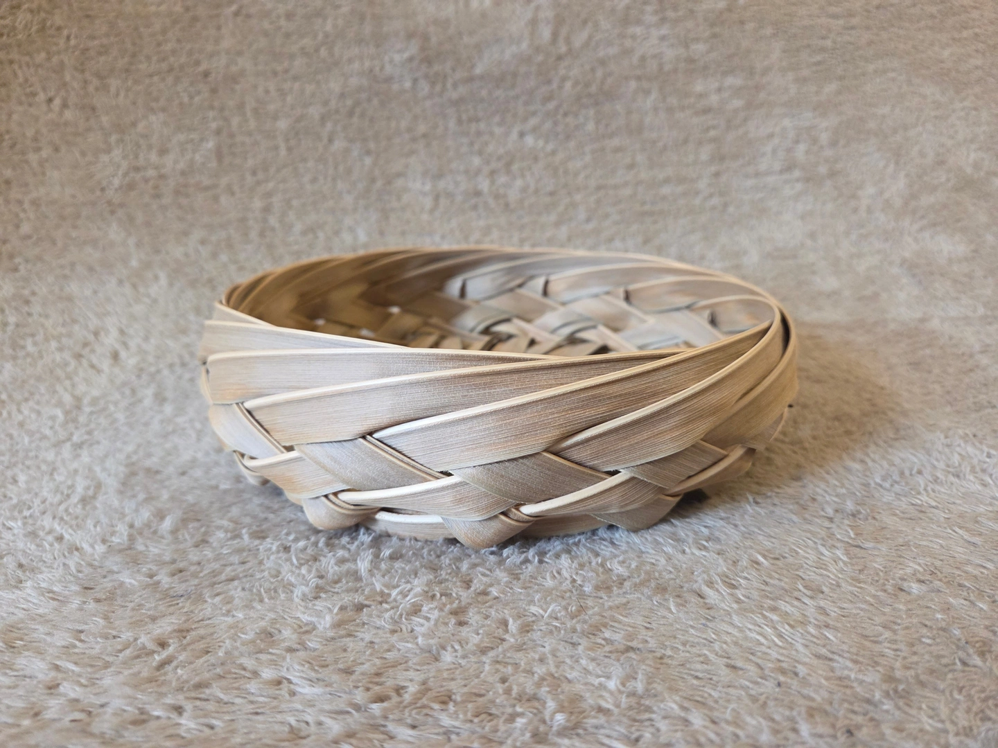 Simple, stylish and eco-friendly handwoven bamboo basket. Great for bread, fruit or as a catch-all on an entryway table. Neutral natural tone with a braided rim and spiral base pattern.