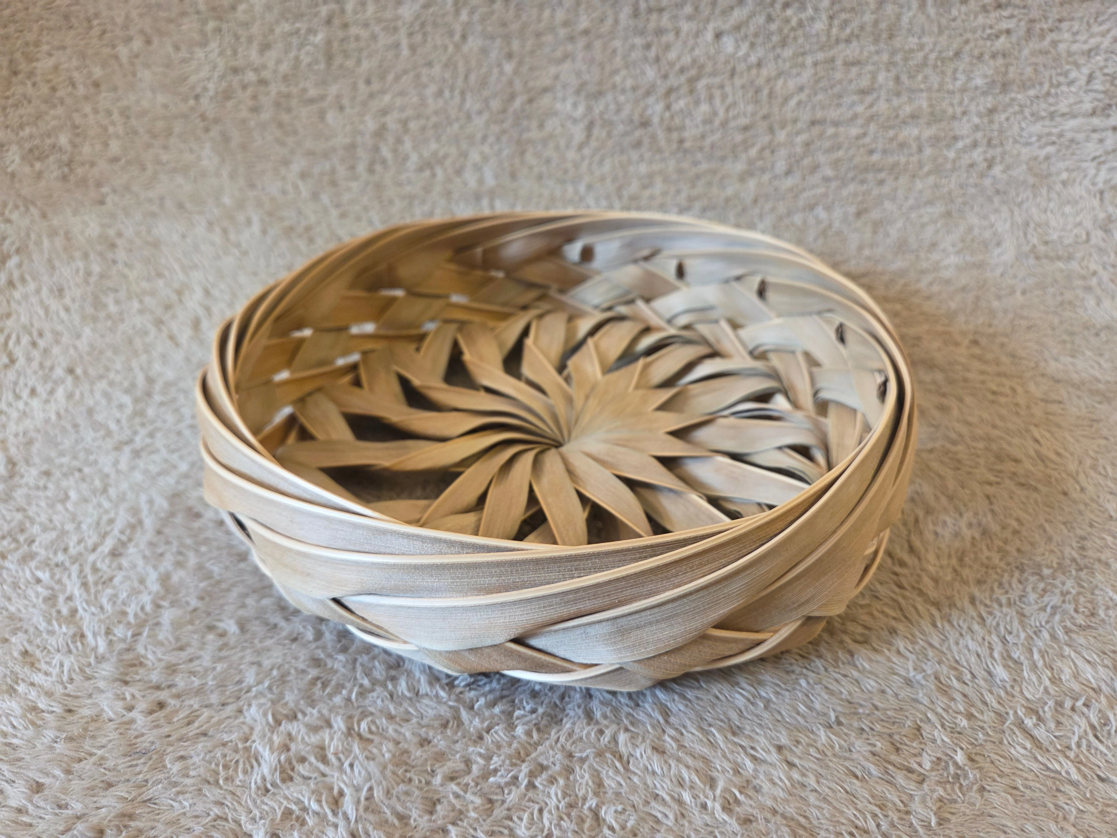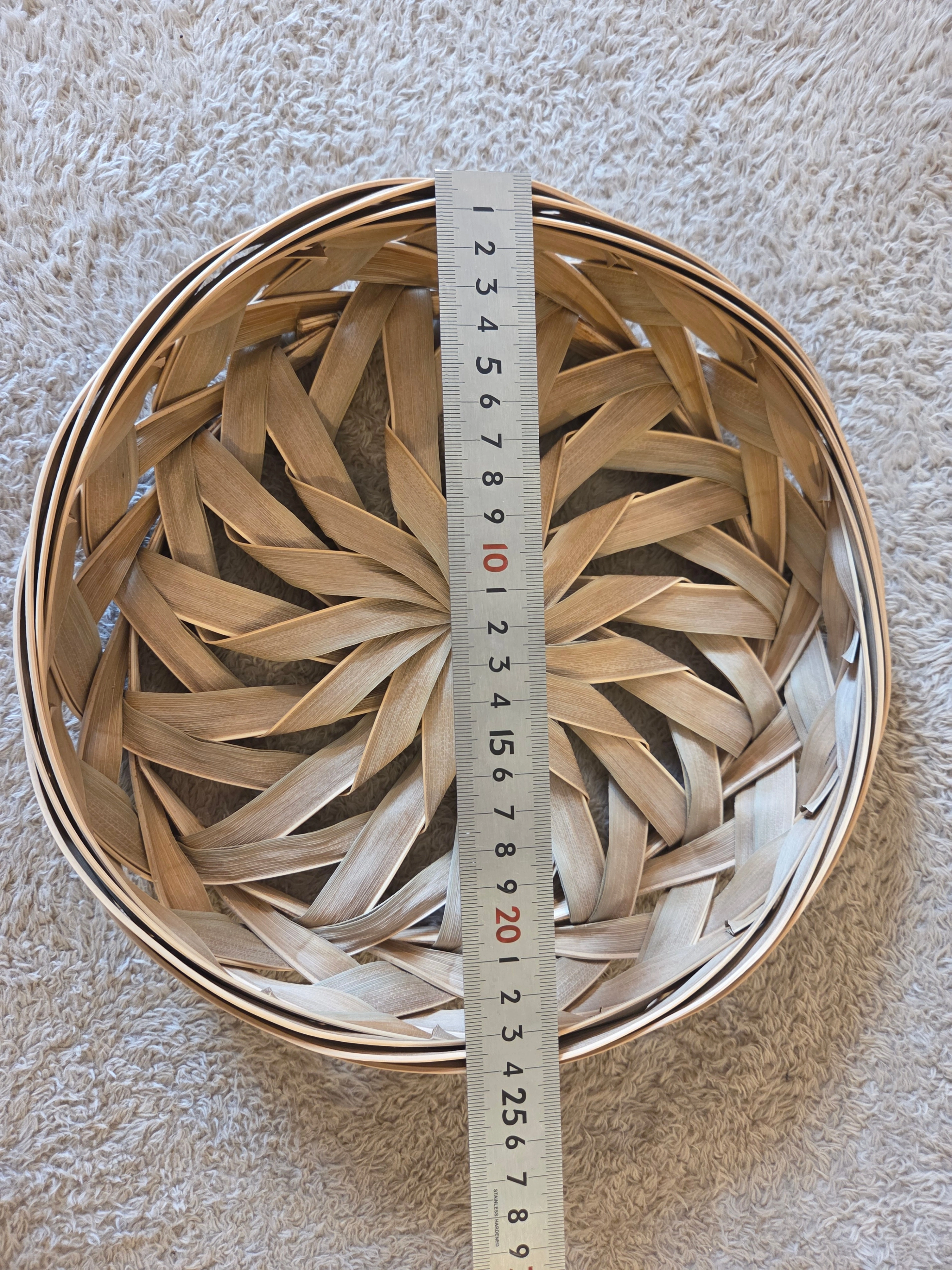 Simple, stylish and eco-friendly handwoven bamboo basket. Great for bread, fruit or as a catch-all on an entryway table. Neutral natural tone with a braided rim and spiral base pattern.