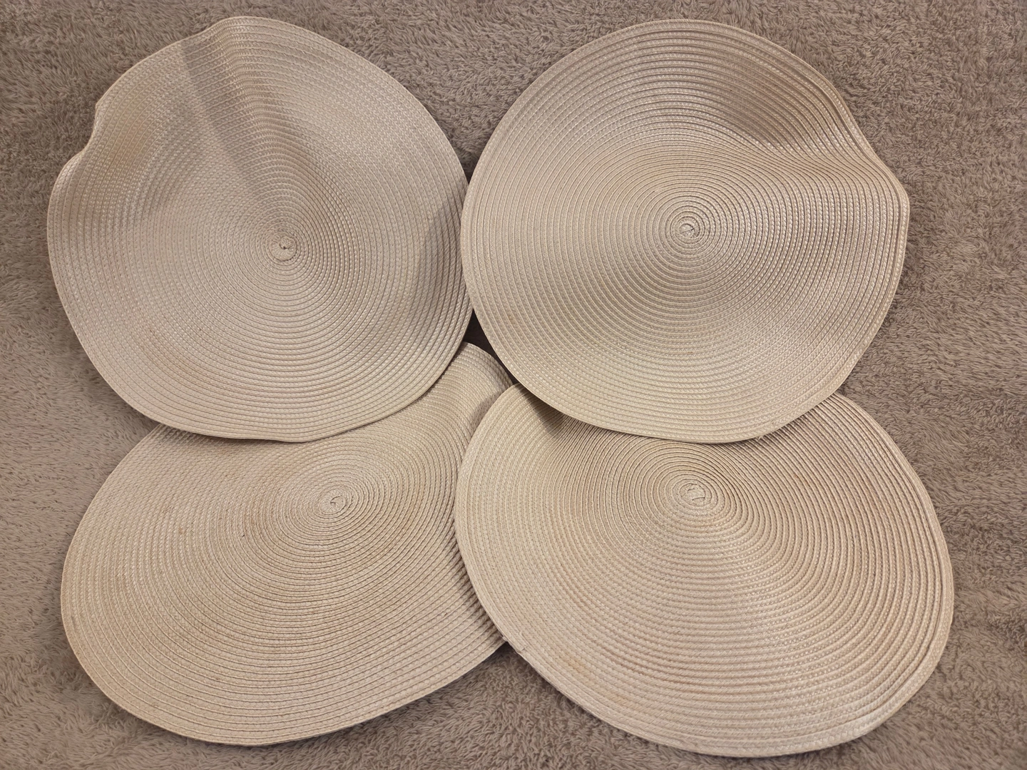 Simple, neutral set of 4 round woven placemats in beige. Braided synthetic fiber (polypropylene-style) that wipes clean and protects your table from scratches and warm plates.