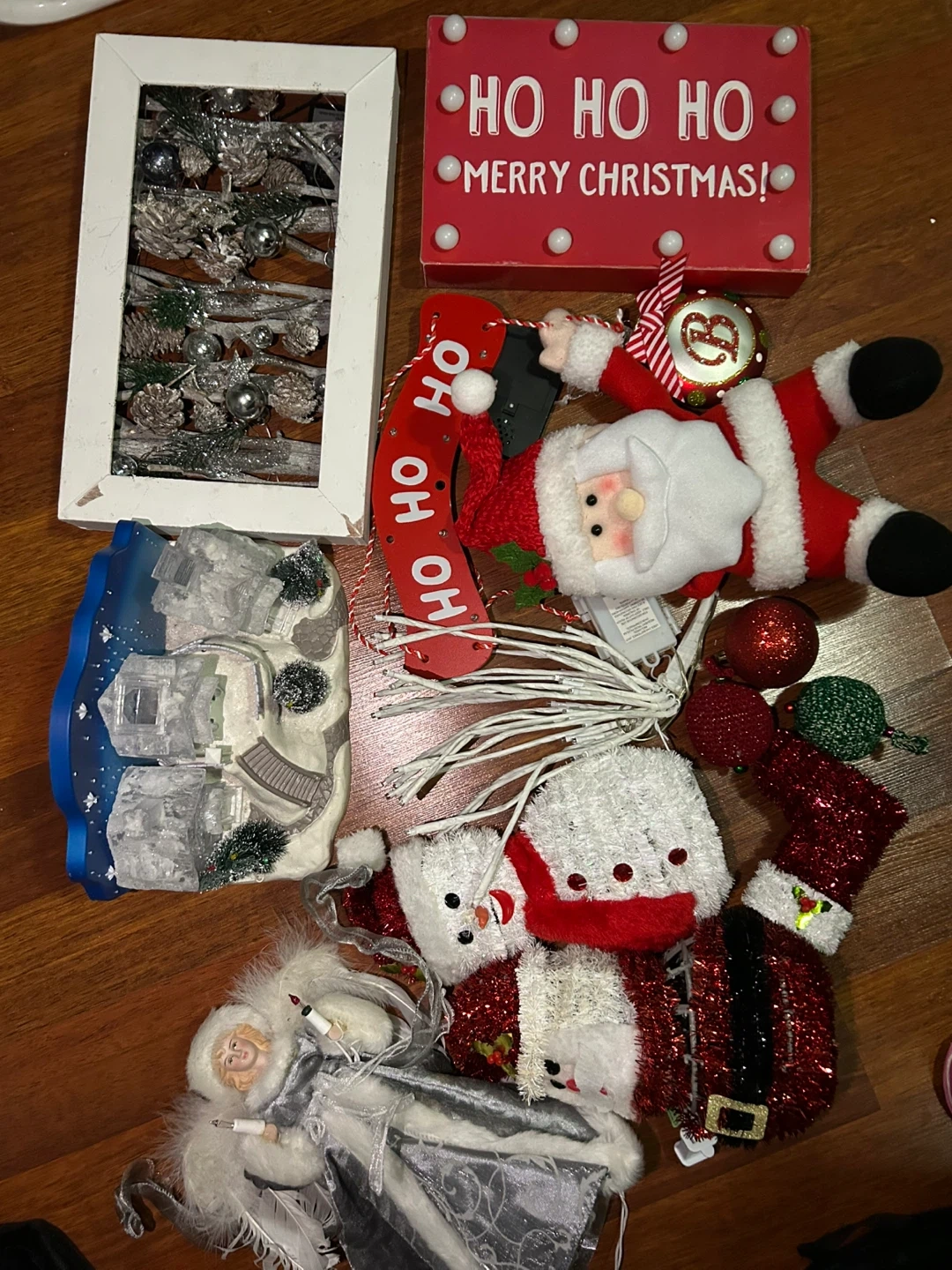 Selling a lot of assorted Christmas decorations. Includes a light-up "Ho Ho Ho Merry Christmas" sign, Santa and snowman figures, angel figurine, and other festive ornaments. Perfect for adding some holiday cheer to your home! Some lights could not be working.