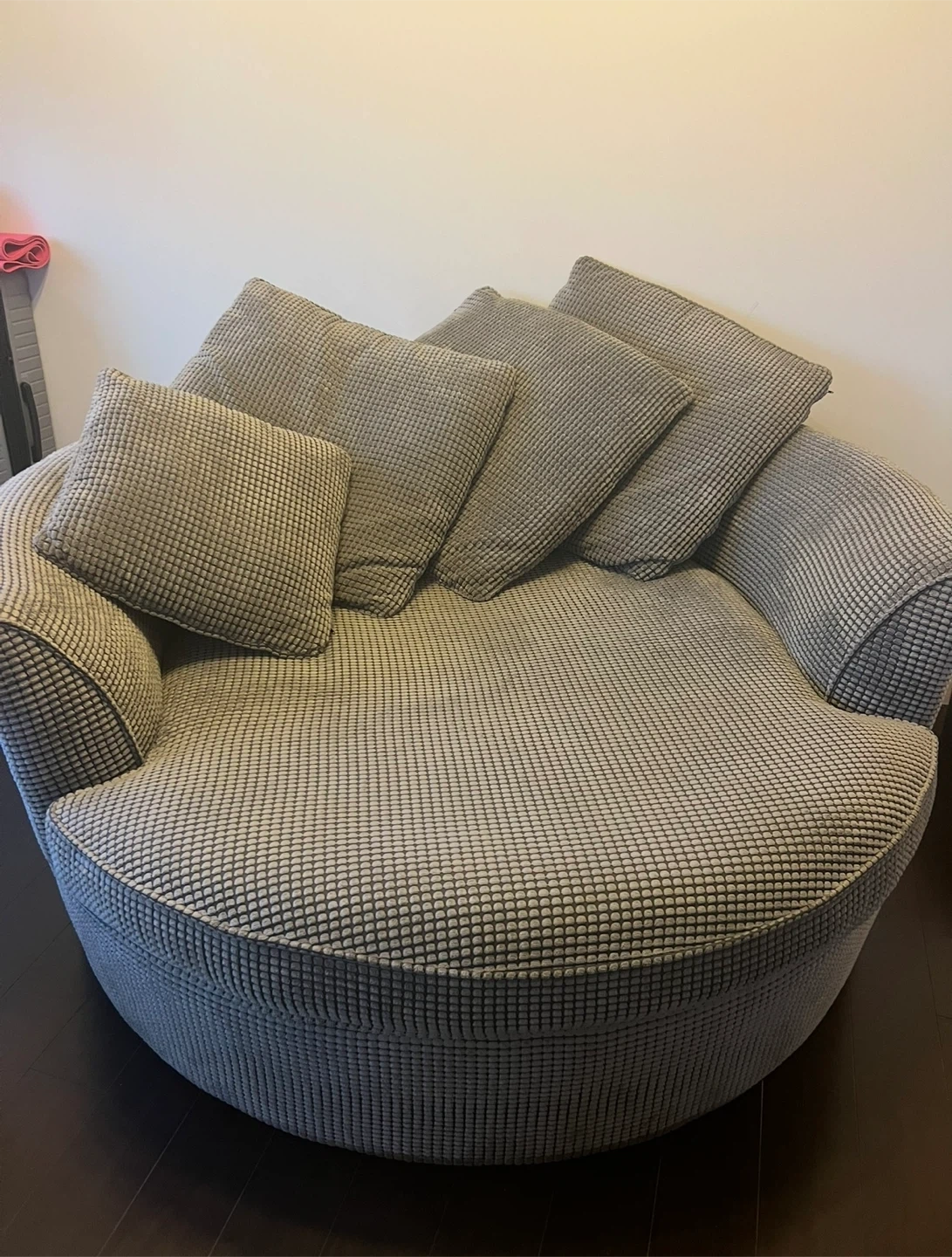 Here's a comfy oversized round sofa that would be a great addition to any room! It comes with several matching pillows for extra comfort. The sofa is in good condition and ready for a new home. Perfect for relaxing and unwinding after a long day. Measurements From edge to edge Width 4.5 ft *