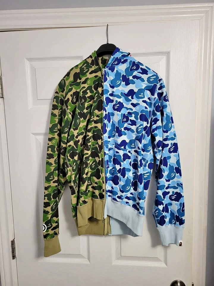 Blue and green Bape camo double hoodie. Size Large but fits like a Medium. Lightly worn, in great condition. Perfect for layering or streetwear style.